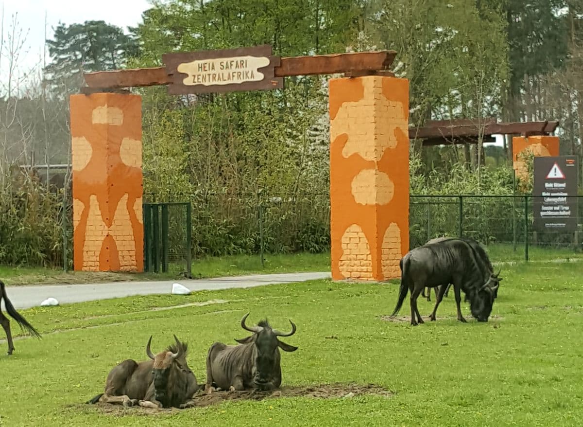 Los geht es natürlich in Afrika. Jedes Areal beherbergt Tiere eines anderen Kontinents. Freundliche Antilopen schauen scheu zum Bus. Die Giraffen, erzählt der Busfahrer, sind heute nicht draußen, denn sie bekommen Sonnenschirme ins Gehege gebaut. Und tatsächlich am Ende der Tour sind die 10 Meter hohen Sonnenschirme installiert und die Giraffen schauen von ihrem schattigen Plätzchen zu uns herunter...