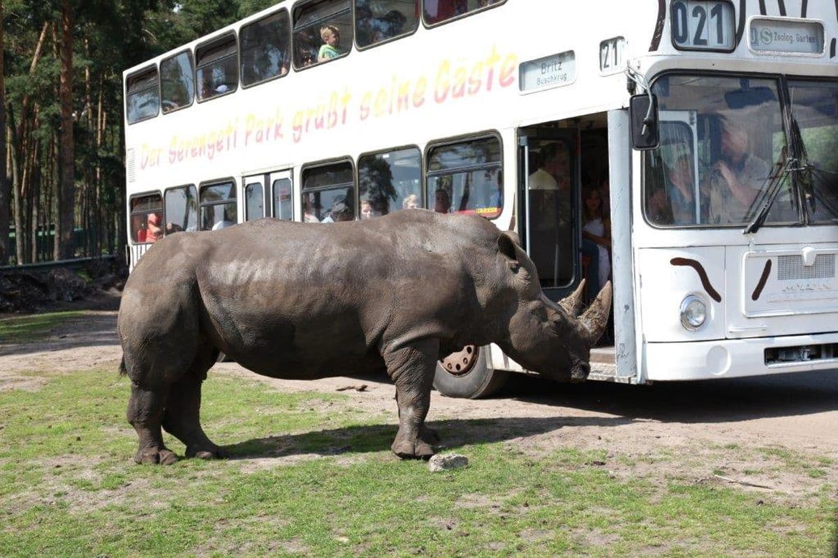 Die Busfahrt geht nicht weiter. Ein Nashorn blockiert den Weg. Es macht auch keine Anstalten, die Straße zu verlassen. Na gut, sagt der Busfahrer, werden wir den Dicken begrüßen. Er nimmt den Riegel von der Tür ab und öffnet die Bustür. Tatsächlich, das Nashorn schaut einmal rein und begibt sich dann gemächlich zur Wasserstelle. Die Bustür geht wieder zu und man hört wie bei allen Passagieren wieder langsam die Atmung einsetzt. Der Busfahrer grinst.