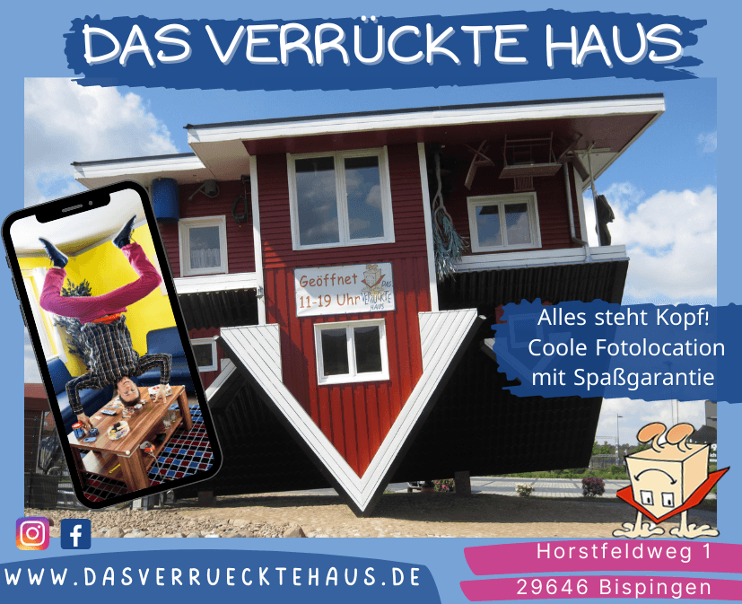 Lasst Euch aus dem Alltag entführen in eine völlig verdrehte und verrückte Welt. Hier im VERRÜCKTEN HAUS steht nicht nur ein ganzes Haus auf dem Dach! Auch die gesamte Inneneinrichtung: Stühle, Tische, WC, Lampen, Schränke und vieles mehr hängen an der „Decke“, dem eigentlichen Fußboden.