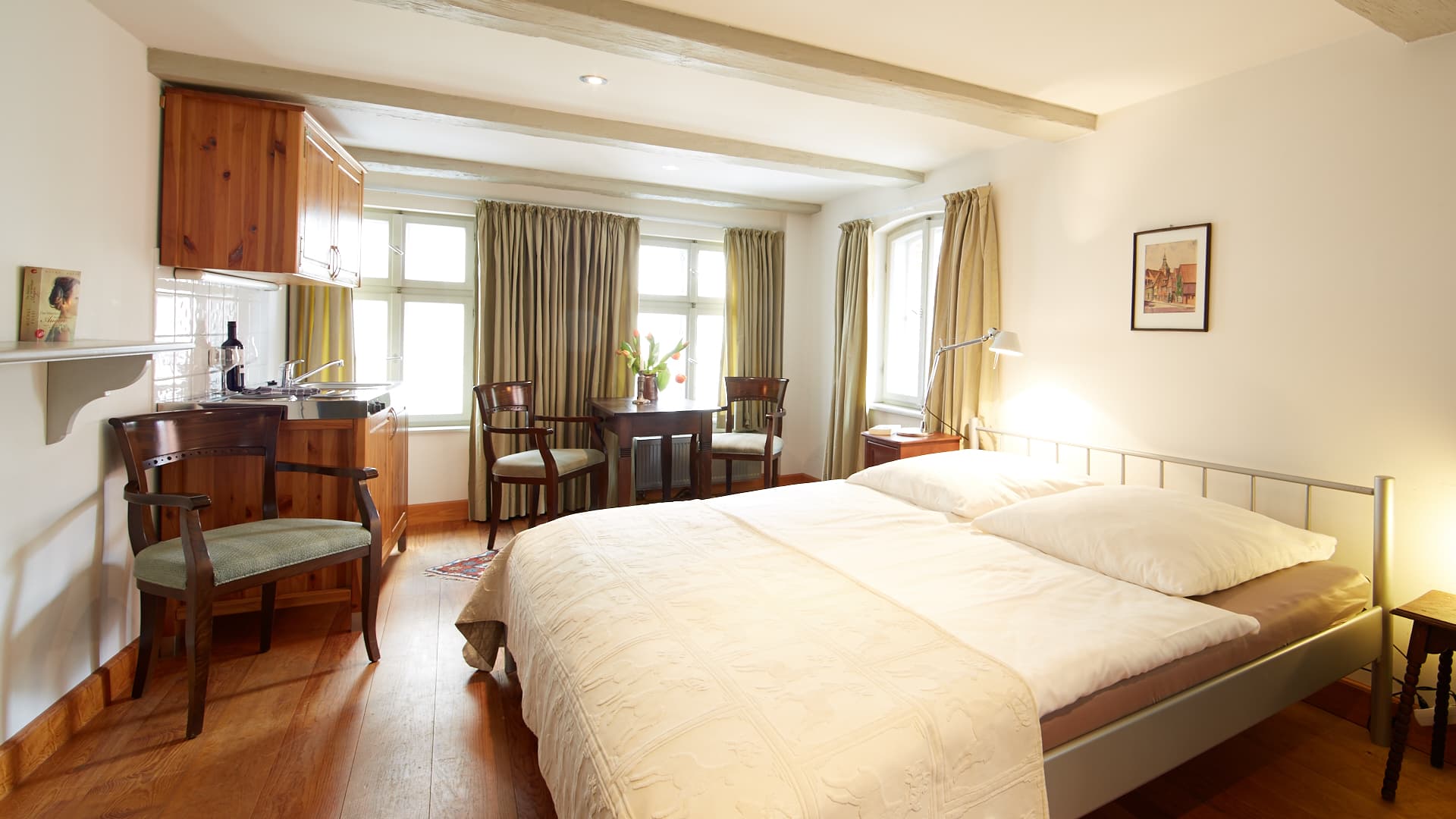 Das eindrucksvolle, behutsam sanierte Baudenkmal ist heute ein modernes, umweltschonend geführtes Nichtraucherhaus mit individuell eingerichteten Doppelzimmern und großzügigen Suiten, die sich über zwei Wohnebenen erstrecken.