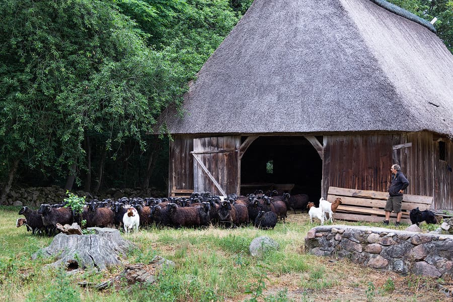 Geführter Eintrieb der Schnuckenherde: Mittwochs 17.15 Uhr Treffen auf der Hofanlage unter der Eiche vor dem Heidehaus.