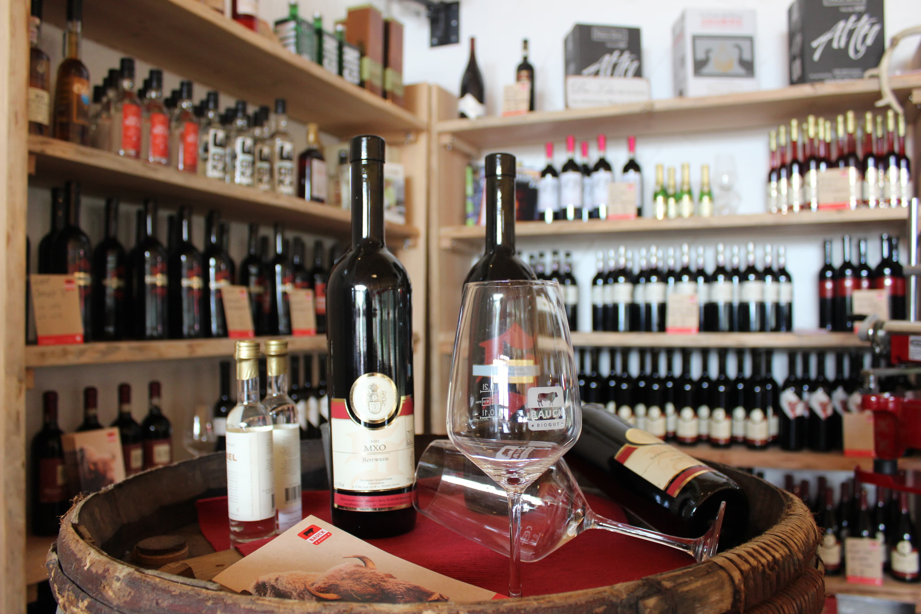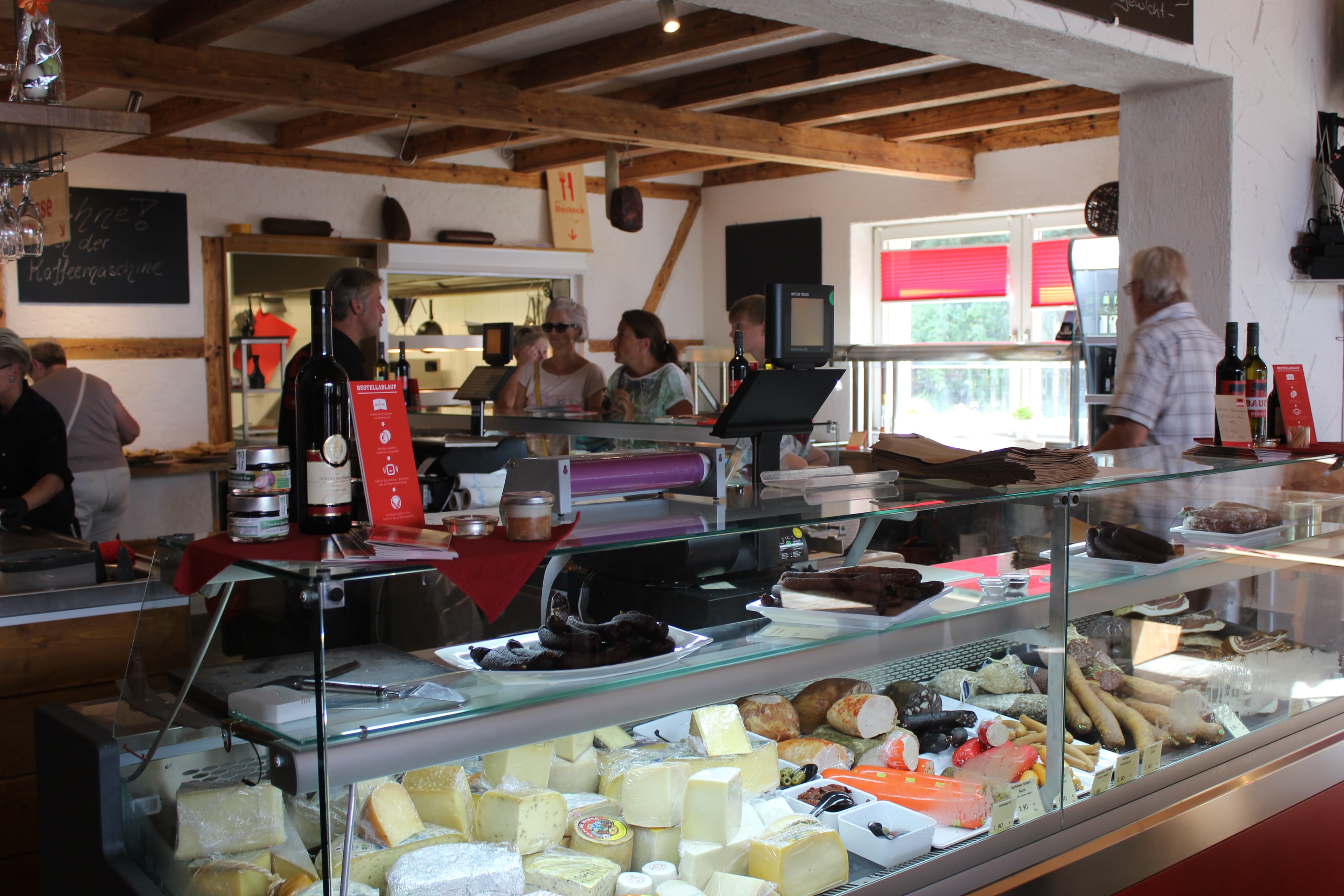 allem nachhaltig produzierten Köstlichkeiten. Fleisch, Käse, Wein und viele weitere Produkte aus eigener Erzeugung können im Hofladen erworben werden. Nach der Besichtigung der Tierhaltung am Hof soll mancher Vegetarier hier schon mit gutem Gewissen eine Bratwurst bestellt haben, erzählt Inhaber Henning Bauck.