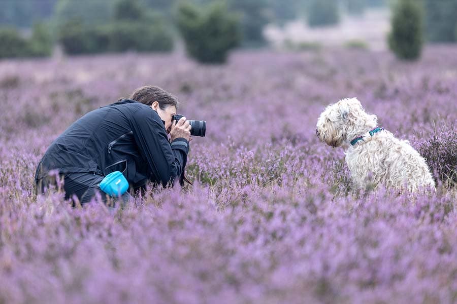 Auch das Fotoshooting mit Hund in der Heide gelingt so. Setzen Sie Ihren Hund auf den einen Weg und nutzen Sie den Parallelweg für ihr Hunde Porträt. Bitte denken Sie daran, dass überall im Naturschutzgebiet einen Leinenpflicht gilt.