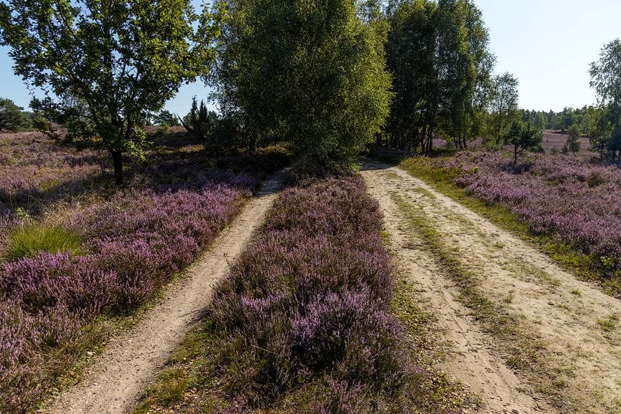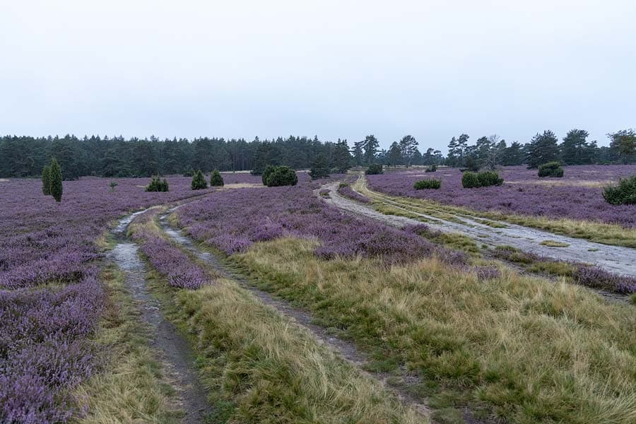 So zum Beispiel ab Parkplatz Eicksberg im Tiefental. Hier gibt es einen Waldweg, der am Anfang parallel zum Weg durch die Heide führt und von dem aus man einen offenen Blick in die Heide hat. Seid ihr zu zweit unterwegs, lässt sich euer Heidewunschbild schnell arrangieren: Ihr verteilt euch auf beide Wege und vom Waldweg aus fotografiert ihr in Richtung Heide. Aus der richtigen Perspektive gelingt das „Inmitten-der-Heide“-Foto.