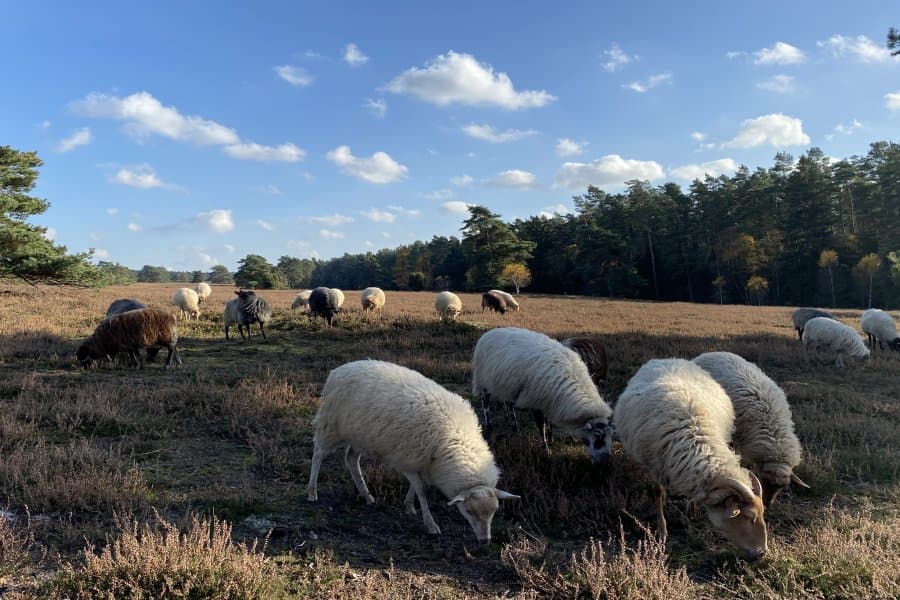 Der Weg ist sehr gut markiert. Mein Blick richtet sich auf die Heidefläche und den angrenzenden Wald. Schon nach kurzer Zeit entdecke ich braune, schwarze und weisse Punkte in der Ferne. Schnell wird klar, dass es sich um eine Schnuckenherde auf dem Weg in den heimatlichen Stall handelt.