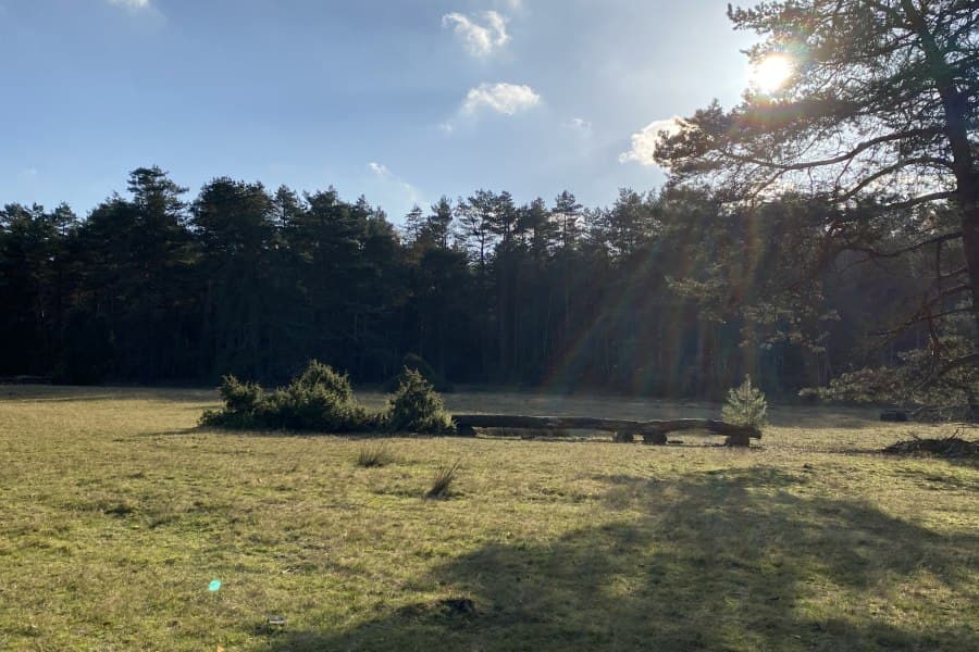 Entlang des Weges laden immer wieder Holzbänke zur Rast ein. Herrliche Ausblicke auf die Heidelandschaft, die sich mit wechselndem Sonnenlicht immer wieder neu präsentiert. Irgendwie zieht es mich weiter, ich möchte noch mehr sehen. Ein nettes Gespräch mit zwei älteren Damen, die sich über die „Baumhindernisse“ wundern. Wir rätseln ein wenig gemeinsam, einigen uns auf Hindernisse für die Reiter und freuen uns über den Panoramablick auf die weite Heidelandschaft. Durch den Wald geht es zum Tiefental, wo der Pastor Ludwig Harms (1808-1865) manchmal seine Predigten hielt. Der Gründer des Hermannsburger Missionswerkes hatte sich einen wahrlich schönen Platz für seine Gottesdienste ausgesucht!
