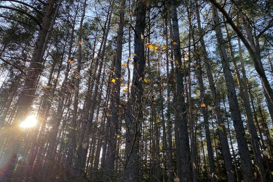Vom Parkplatz aus geht es jetzt auf eine „lange Gerade“. Hohe Kiefern am Wegesrand, ein herrlicher Blick durch die Baumkronen in den blauen Himmel, Sonnenlicht und Sonnenstrahlen – eine sehr beeindruckende Strecke auf meinem Weg zurück zum Wanderparkplatz Misselhorner Heide.