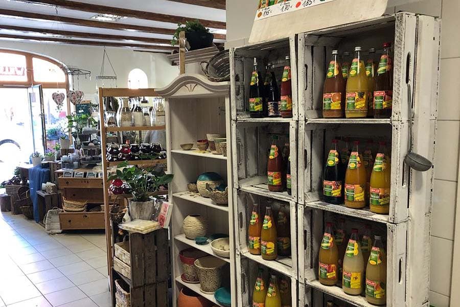 Auch weiter verarbeitete Produkte wie herzhafte Darmwurst und Wurstkonserven, Fruchtaufstriche, Frucht- und Gemüsesäfte und ausgesuchte Weine vom Weingut Schauf vervollständigen das Sortiment.
