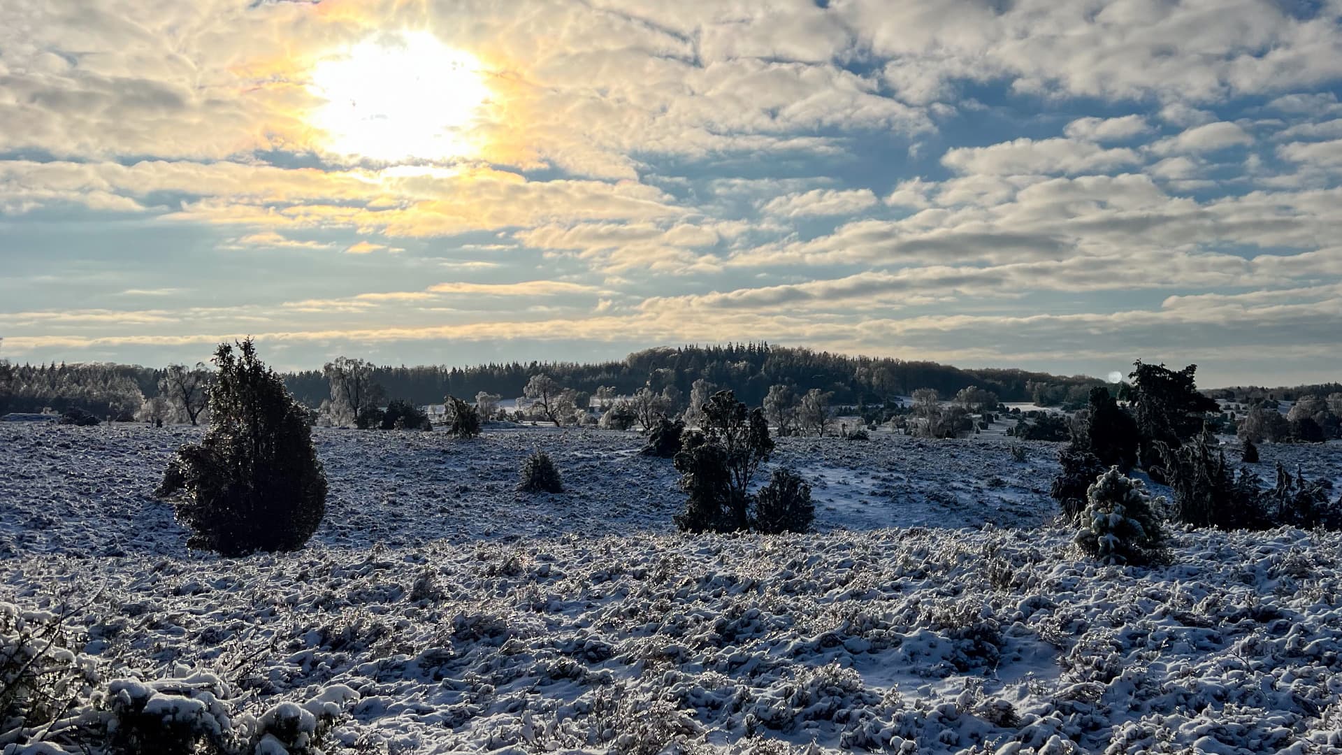 Über den „Schoolstieg“ und einer historischen Granitbrücke führt der Weg zum „Hogewilse“. Der Blick ins vielleicht winterliche Heidetal ist schon ein Highlight am Jahresbeginn. Wacholder säumen den Weg über weitere „Bergeshöhen“ dem Startpunkt entgegen.