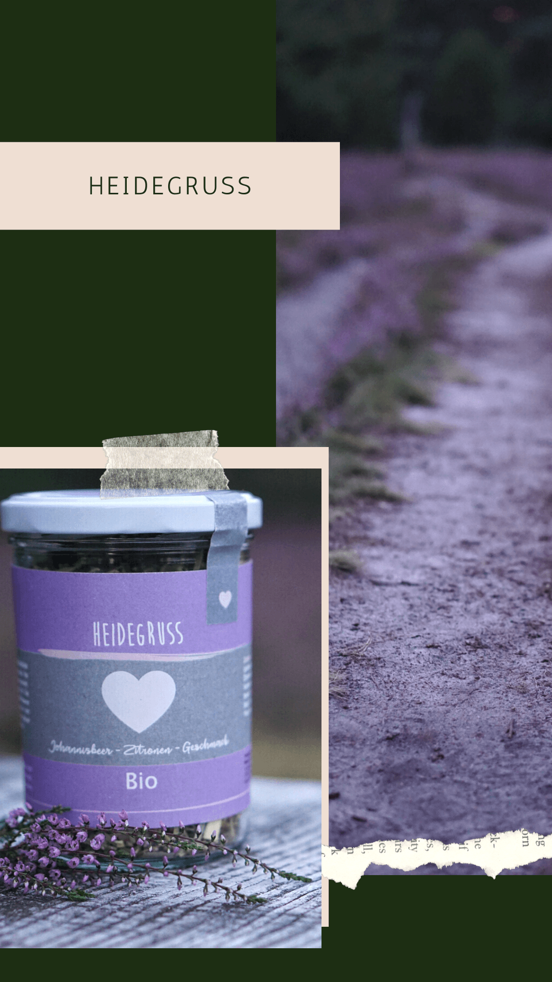 Bio zertifizierter Tee in einer nachhaltigen Verpackung in verschiedenen, besonderen Mischungen. Unter anderem der Heidegruss, mit Heide, Lemonengras und fruchtigen Beeren.