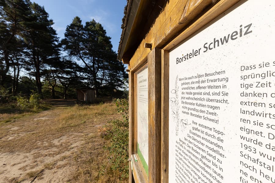 Die Borsteler Schweiz ist ganz anders, als die anderen, sehr weiten Heideflächen. Hier ist die Landschaft zerklüftet, voller Täler, voller Sonne und Schatten Bilder. Nicht wie sonst in der Heide sehr weit und flach. Die Eiszeit hat dieses Tal geformt.
