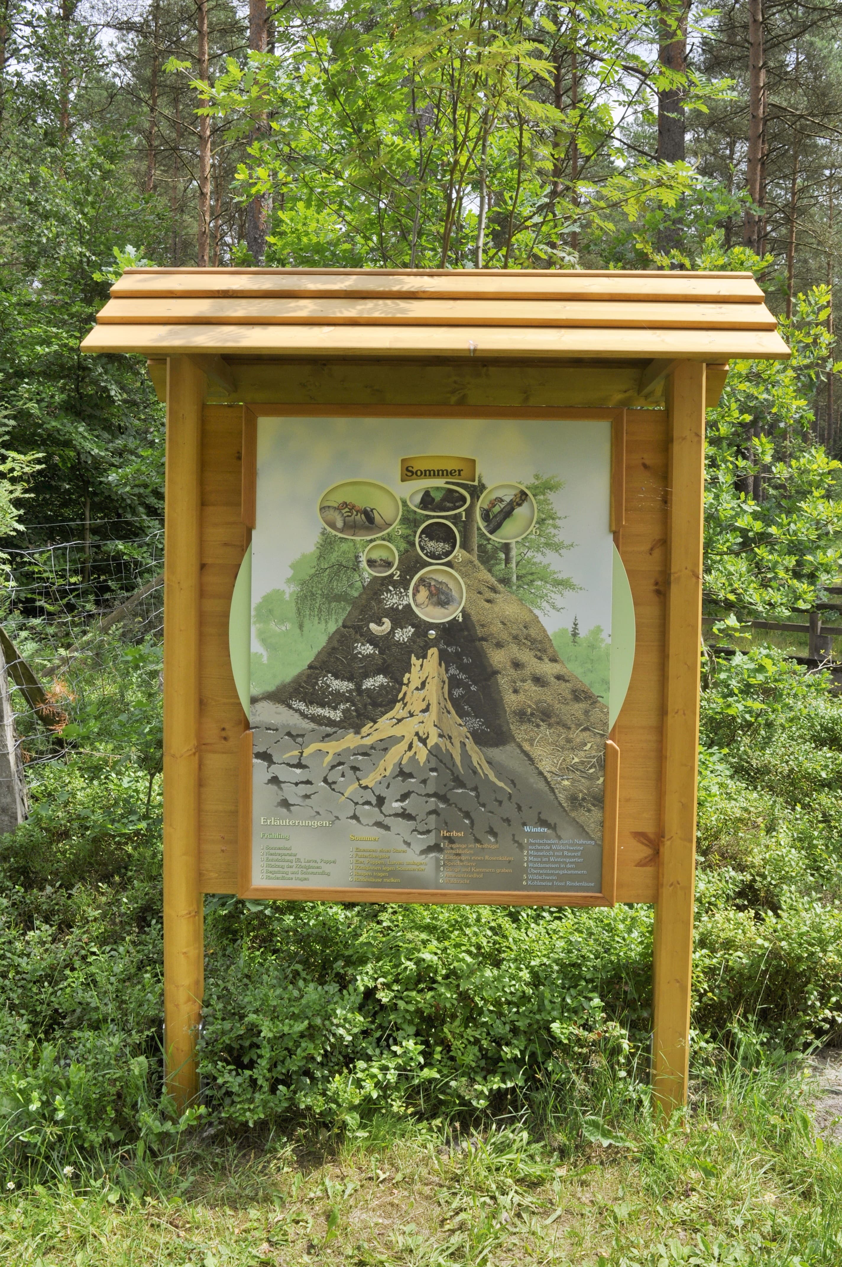 Der Holzrahmen auf dem Walderlebnispfad lenkt den Blick auf einen Ameisenbau der Roten Waldameise. Bis zu zwei Millionen Individuen – bestehend aus Arbeiterinnen, Männchen und Königinnen – leben hier zusammen. „Ameisen sind Landschaftspfleger, sie lockern mit ihren Gängen den Boden auf“, erklärt Knut Sierk vom Waldpädagogikzentrum Lüneburger Heide, „hierdurch können sich Pflanzen besser verwurzeln“. Zudem säubern die Ameisen den Wald, transportieren tote Tiere ab und sie vertilgen Forstschädlinge in großen Mengen. Gleichzeitig sind sie Nahrungsquelle für andere Tiere wie Kröten, Vögel, Eidechsen und Spinnen. Der Eichelhäher nutzt die Ameisensäure zur Gefiederpflege. Die Ameisen dieses Baues schaffen es, in der Vegetationszeit zigtausende Pflanzensamen zu verbreiten.