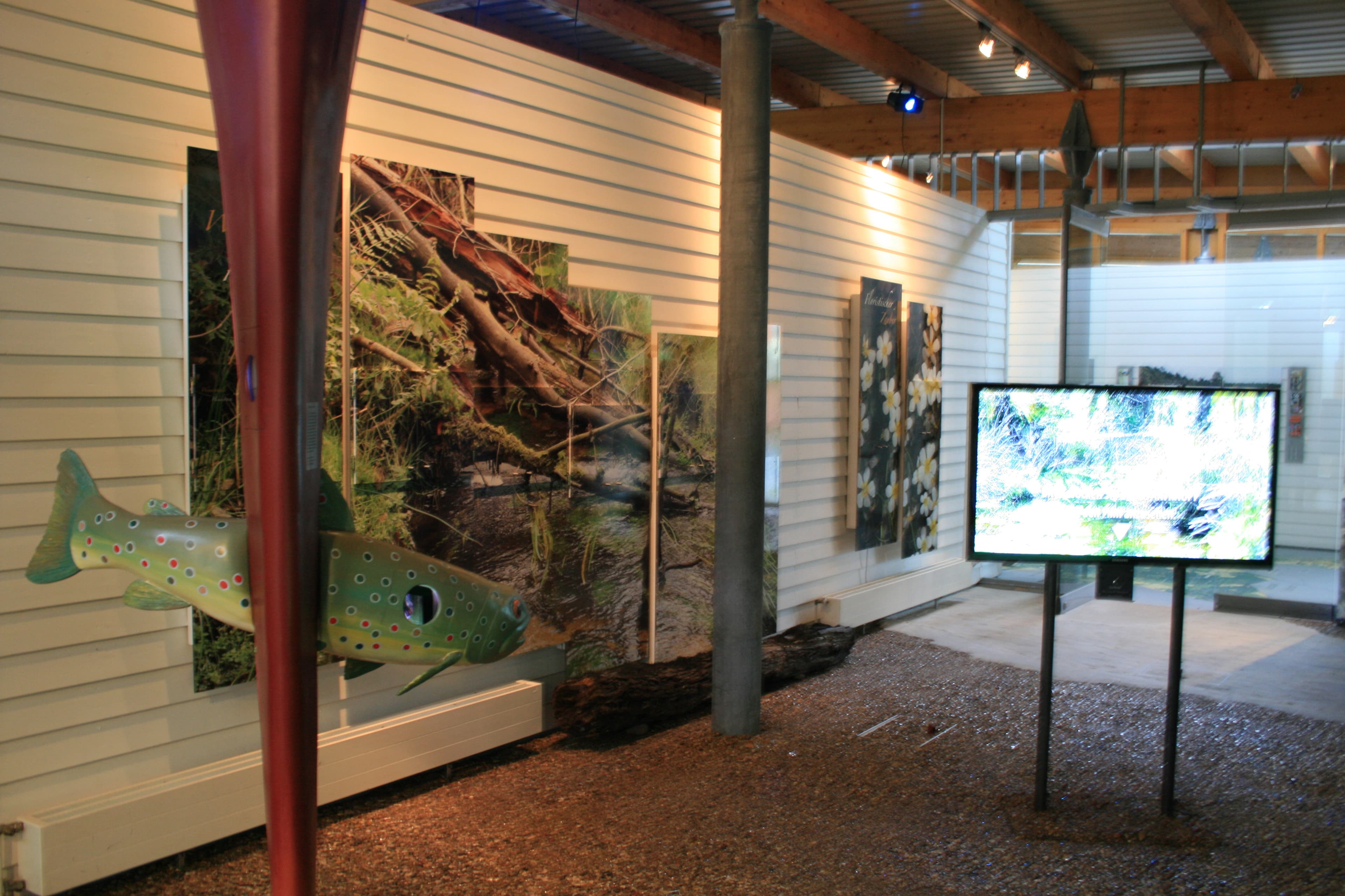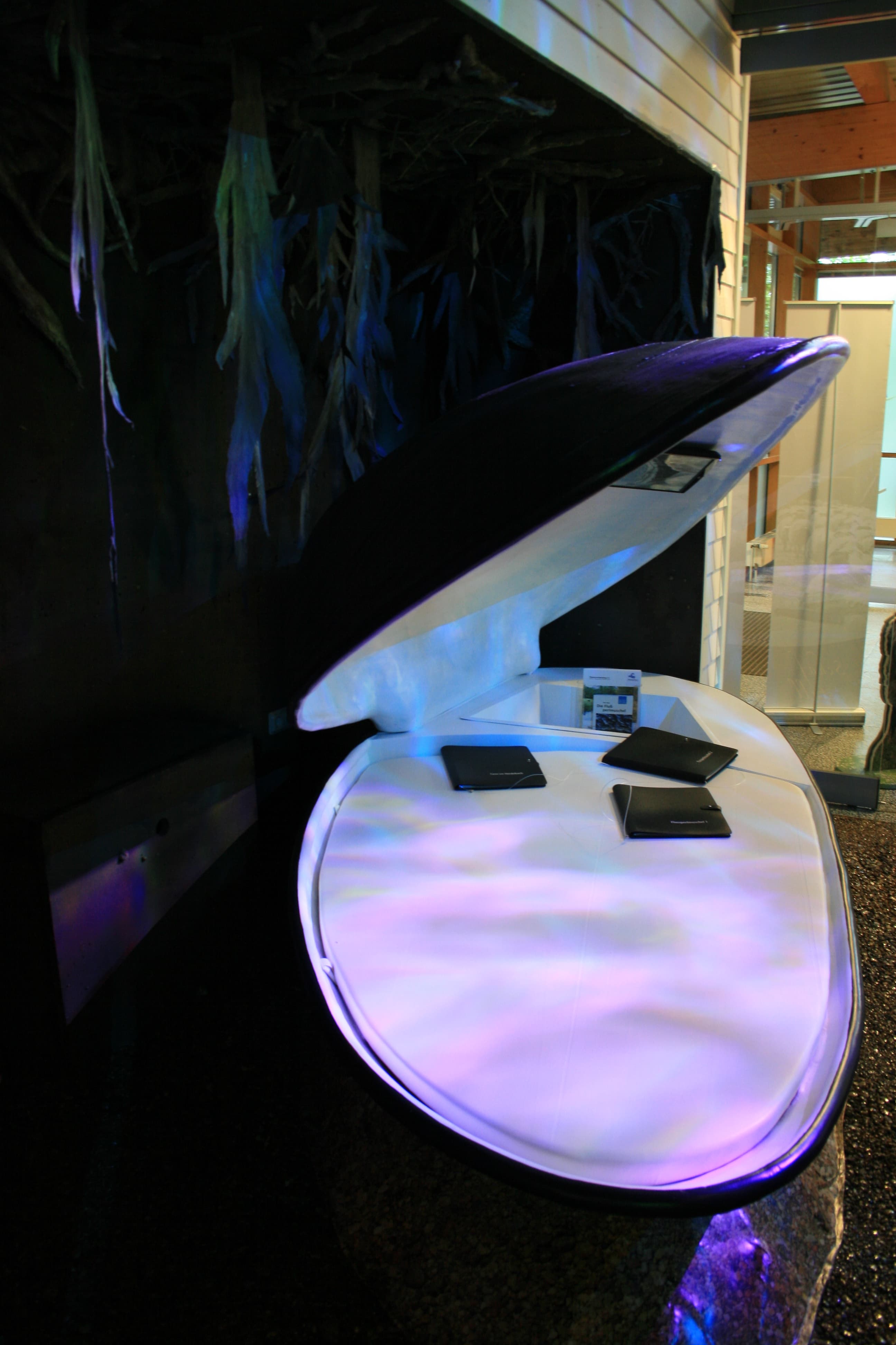 Lichtwerfer projizieren ständig wechselnde Wasserreflexionen und die sogenannte „Kuschel-Muschel“, der Nachbau einer Flussperlmuschel im XXL-Format. Sie lädt ein, sich als Perle in die Muschelschalen zu legen und dort einen Film über die Biologie, Ökologie und Kulturgeschichte der Flussperlmuschel zu verfolgen.