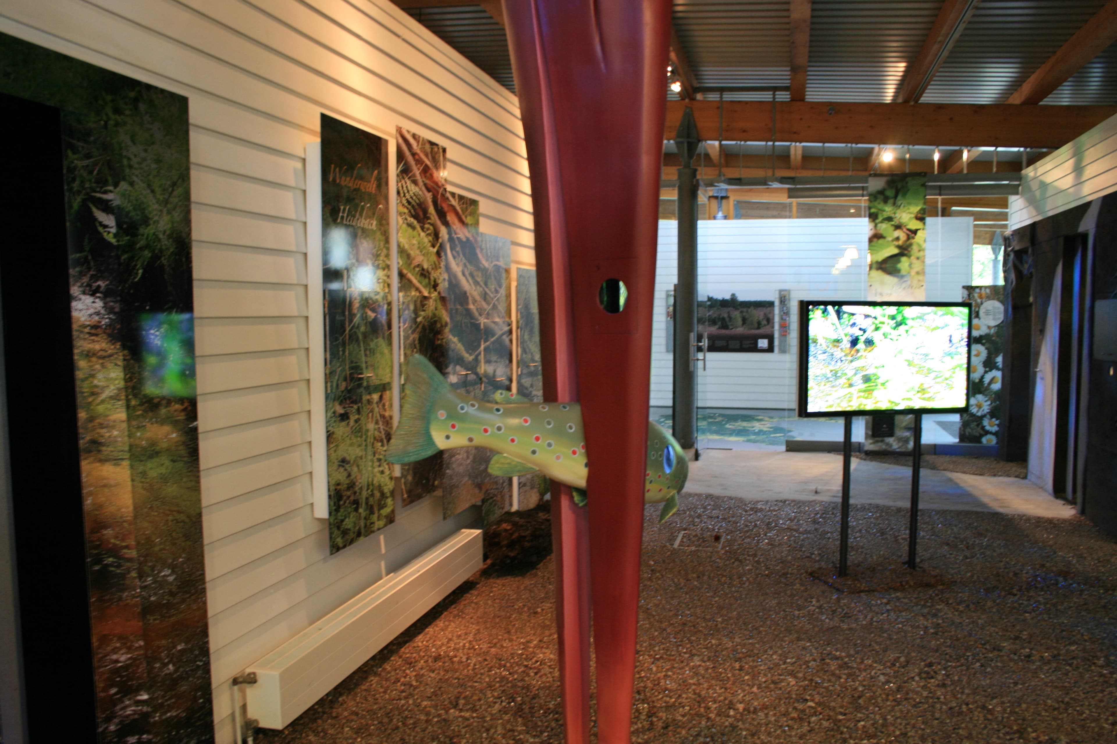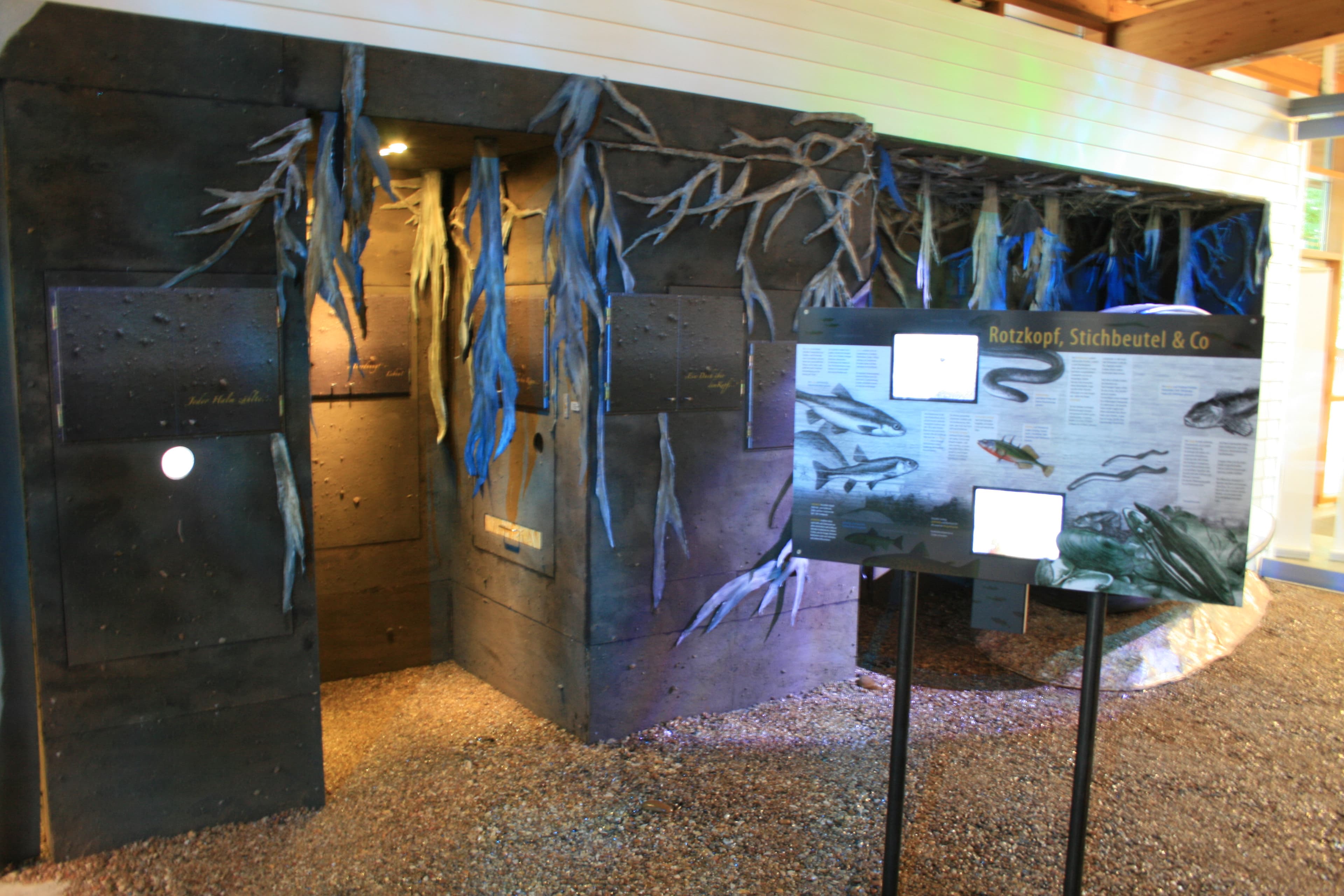 Ein besonderes Augenmerk verdient der riesige Nachbau eines Schwarzstorch-Schnabels, der gerade durch die Wasseroberfläche in den Raum hinunterstößt und eine Bachforelle greift. Eine Erlebnistour durch die Wasserreiche Südheide.