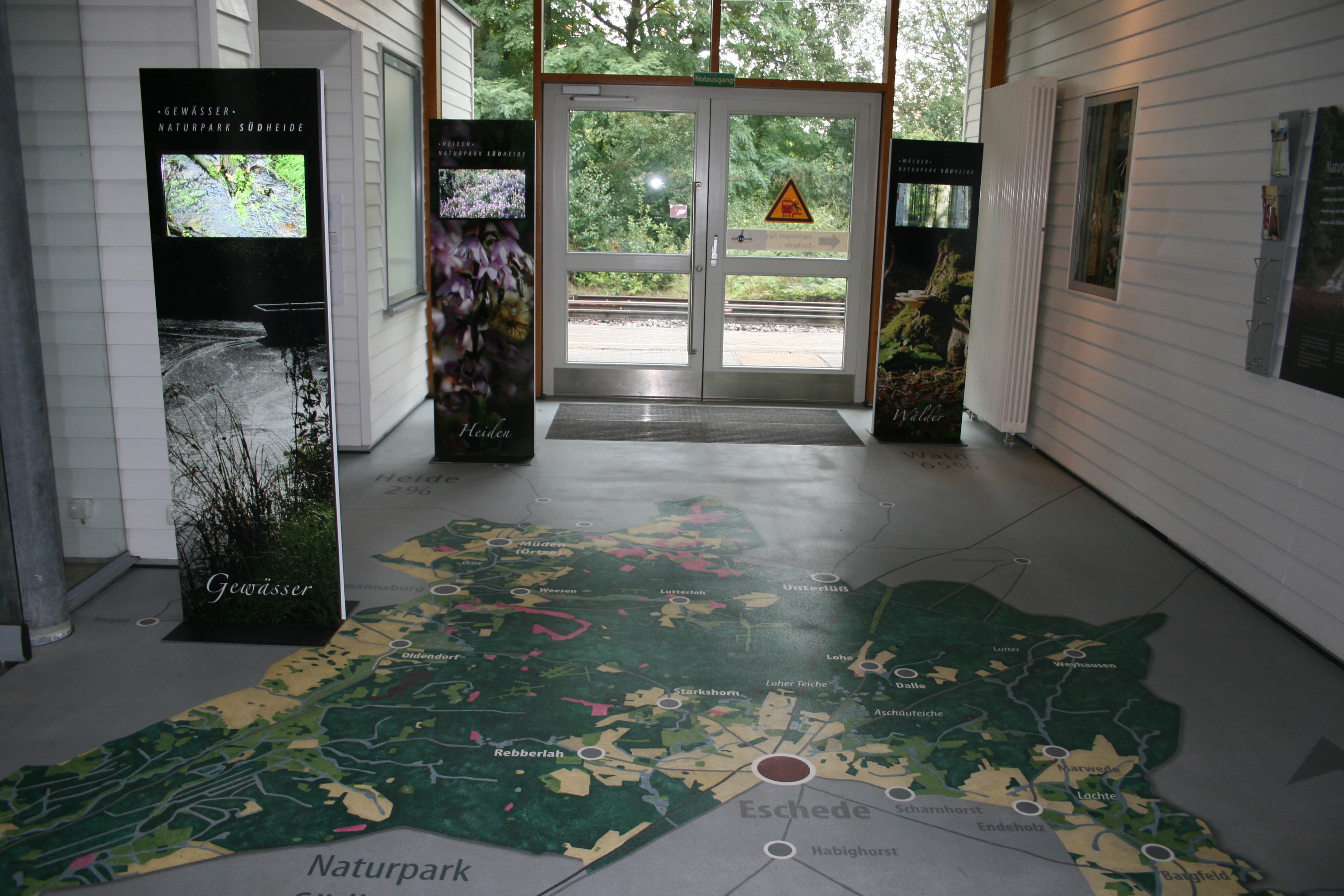 Die alte Wartehalle wurde mit einem Bodenpodest versehen, auf dem eine Bodengrafik in Form einer Landkarte des Naturparks Südheide aufgemalt wurde. Aus dieser Fläche wachsen die Ausstellungselemente in die dritte Dimension, großformatige Fotobanner stellen fünf Landschaftselemente des Naturparks vor: