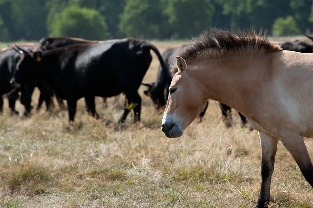 Weiter führt Sie diese Tour durch das Naturschutzgebiet Hornbosteler Hutweide, ein echtes Kleinod. Auf den weiten Wiesen und Weiden können Sie Heckrinder beobachten, eine Nachzucht der ausgestorbenen Auerochsen. Und noch eine Besonderheit hat die Hornbosteler Hutweide zu bieten, an die sich unmittelbar die wunderschöne sanft dahinfließende Aller anschließt: hier weiden nämlich auch Przewalski-Pferde, eine seltene mongolische Wildpferderasse. Die Tiere sind von edler Schönheit.