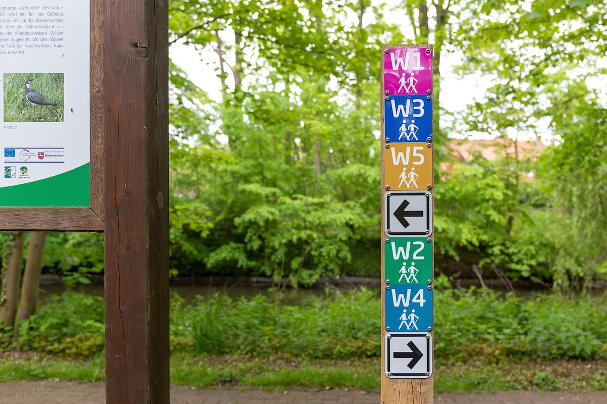 Diese Tour führt durch die wasserreiche Umgebung von Wienhausen. Erfahren Sie, wie die Flussläufe einst entstanden sind und verändert wurden. Vom Startpunkt aus wandern Sie vorbei am Kloster Wienhausen (1) über die „Mühlenstraße“ in die Bockmarsch (2). Am Wegesrand erwarten Sie zahlreiche Teiche und ein Altes Wehr (3). Dann laufen Sie vorbei an den ehemaligen Rieselwiesen (4). Bei diesem alten Bewässerungssystem gestalteten die Bauern das Gelände so, dass regelmäßig Wasser über viele kleine Kanäle auf ihre Wiesen floss. Nur so war ein höherer Aufwuchs auf den Wiesen möglich – das bedeutete mehr Futter für das Vieh. Eine Infotafel vor Ort erläutert das System genauer.