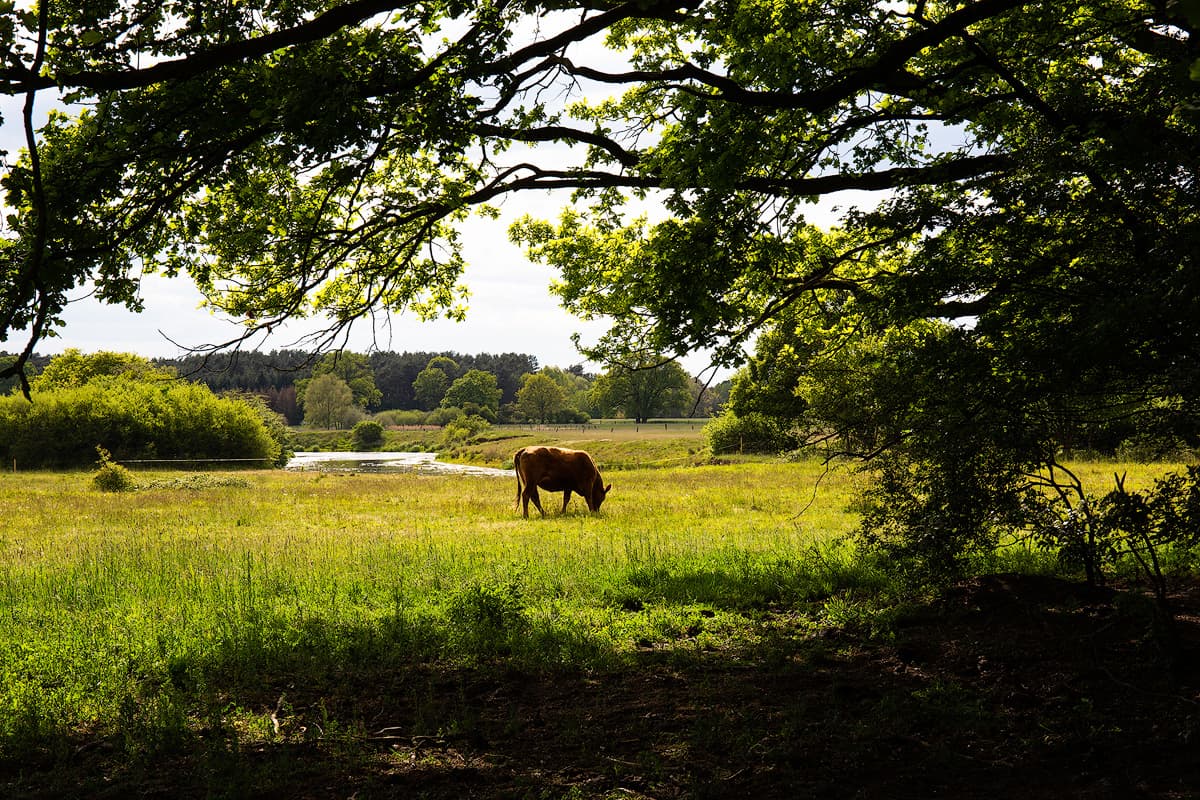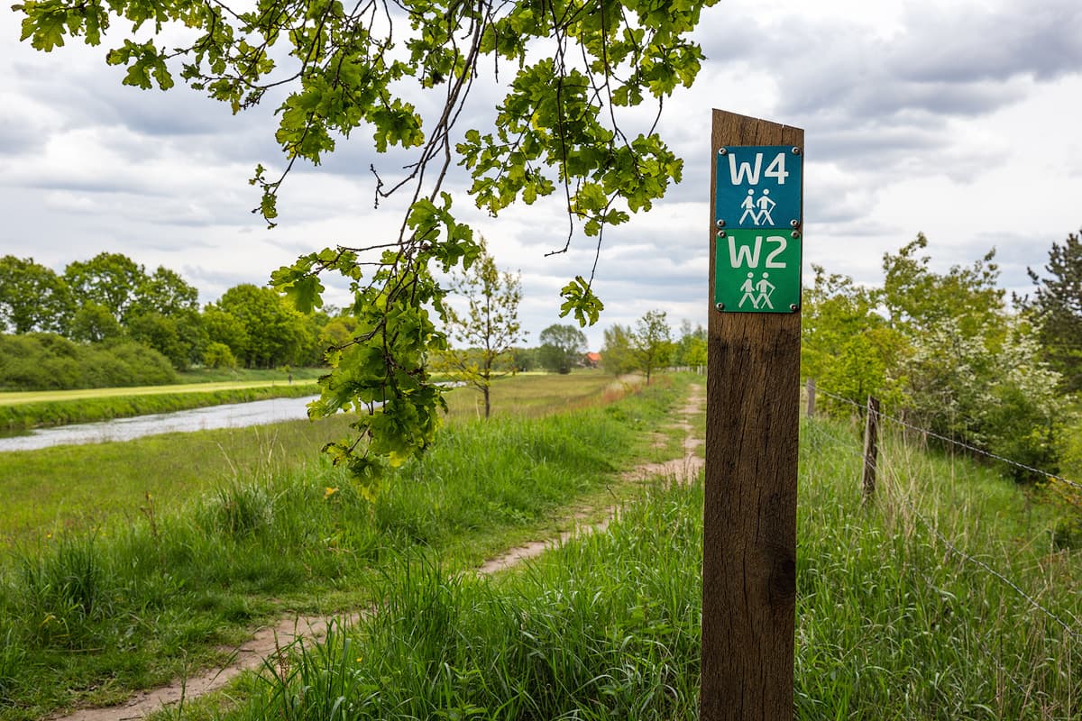 Folgen Sie nun dem „Bockmarschweg“ in die Bockmarsch (3): Der plattdeutsche Ausdruck „Marsch“ bezeichnet Schwemmland, das regelmäßig überflutet wird. Die vielen Wasserwege und Teiche unterstreichen diesen Charakter. Vorbei an Pferdekoppeln, mit Blick auf Höfe am Horizont, geht es zum Alten Wehr (4). Dort befindet sich ein Campingplatz. Der Weg „Am Kanal“ führt zu den ehemaligen Rieselwiesen (5). Eine Infotafel erläutert das einst für die Region typische Bewässerungssystem: Hierfür wurde das Gelände so gestaltet, dass Wasser über ein ausgeklügeltes Gefälle und viele kleine Kanäle auf die Wiesen floss. So erreichten die Bauern einen höheren Aufwuchs auf ihren Wiesen – das bedeutete mehr Futter für ihr Vieh.