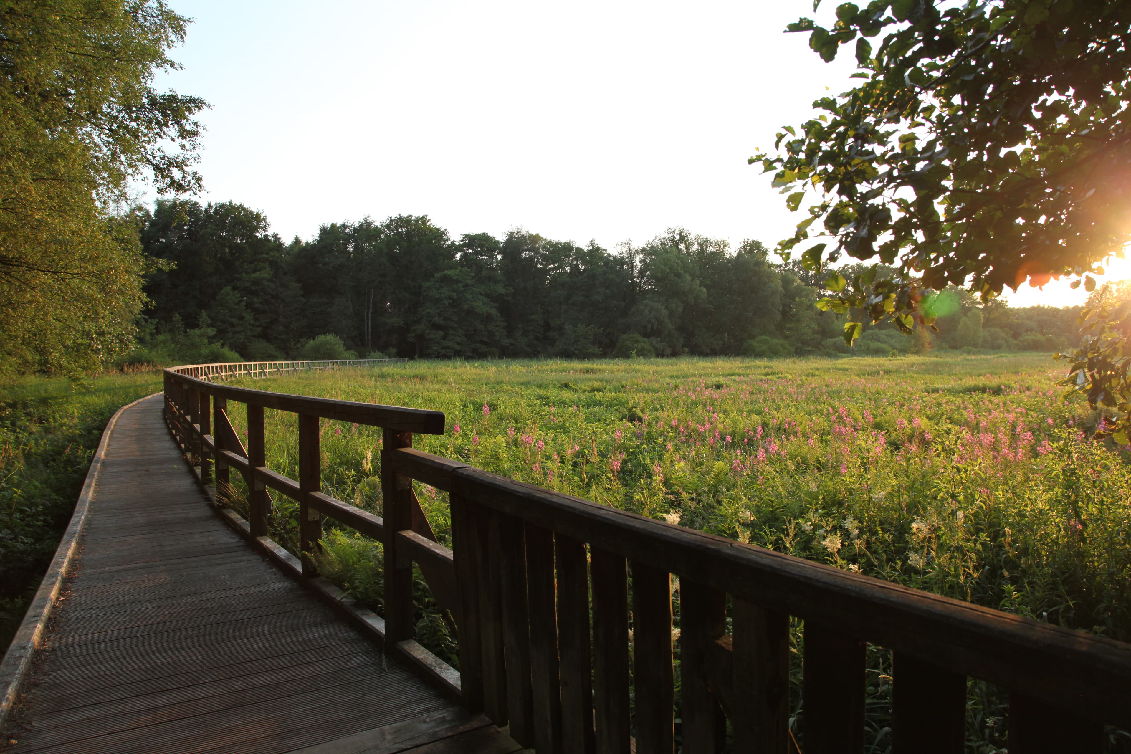 führt auf einem langen hölzernen Steg über sumpfige, ehemalige