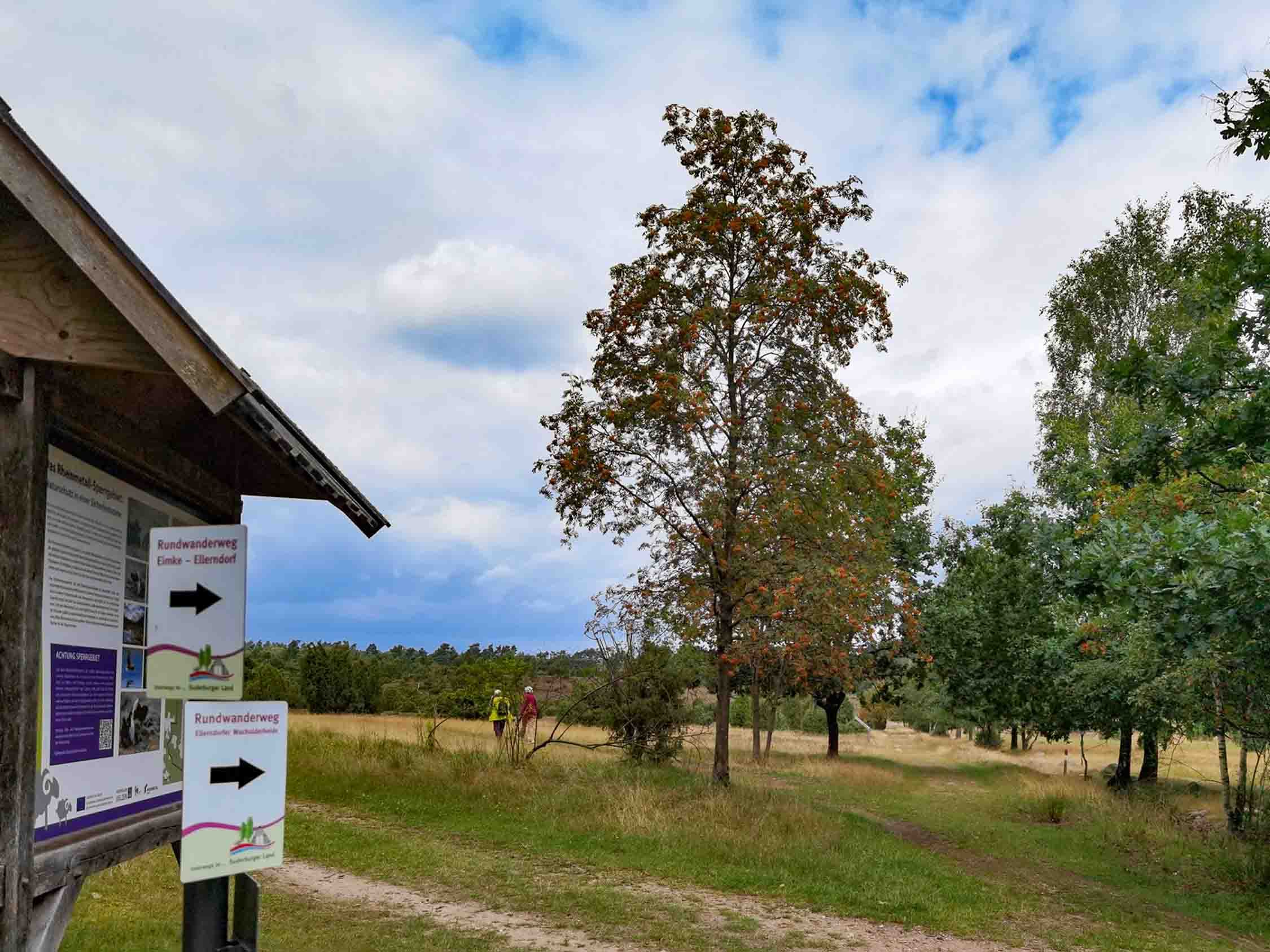 Ausgangs- und Endpunkt der knapp 20 Kilometer langen Strecke, die auch in Abschnitten erwandert werden kann, ist der Ort Eimke. Zweimal überqueren wir unterwegs die Gerdau, unser Weg führt uns hinauf auf den Thonhopsberg und durch die Ellerndorfer Wacholderheide.