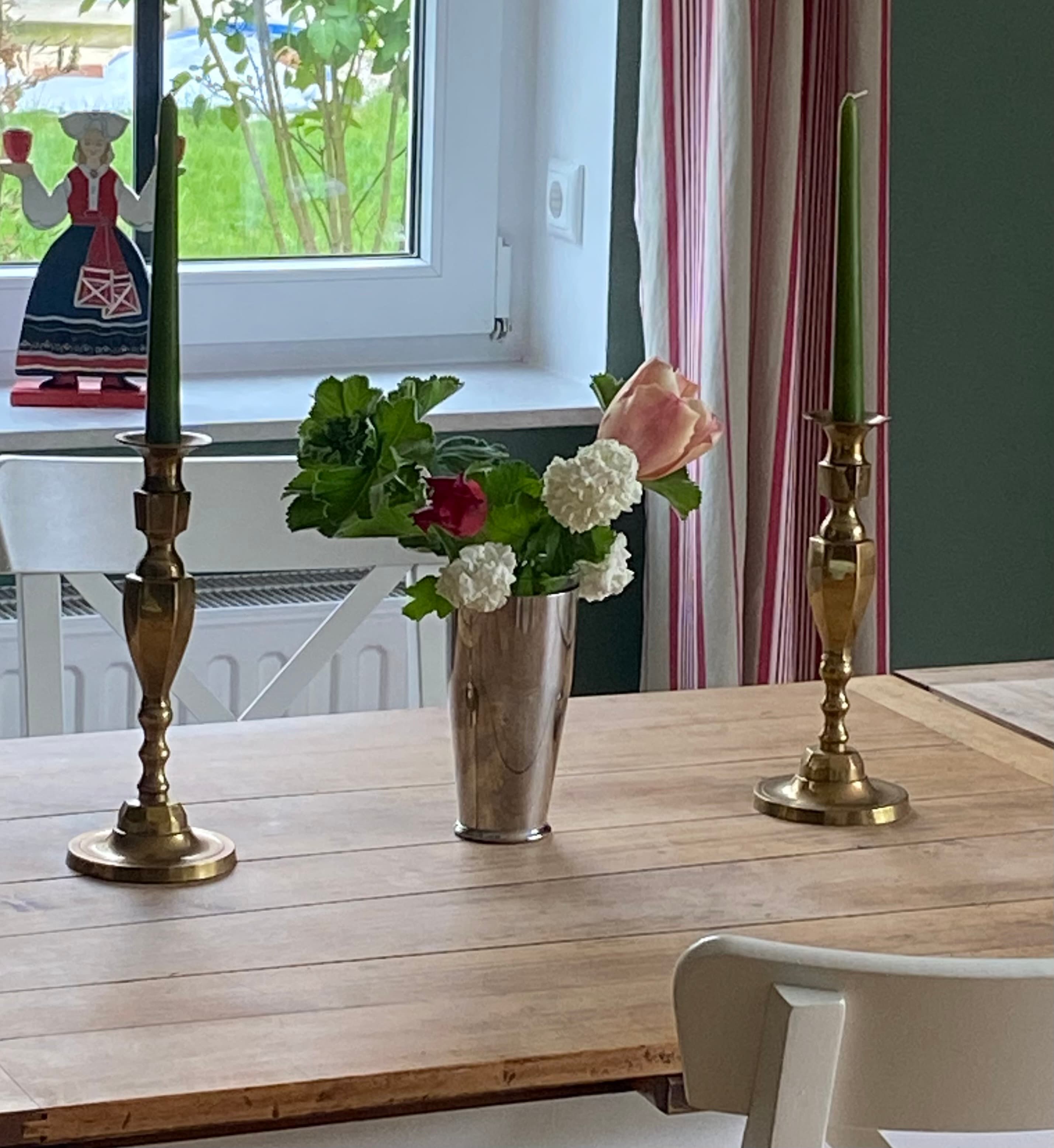 Hübsche Antiquitäten, bequeme Sessel und ein Sofa prägen dieses Zimmer. Sowohl vom großzügigen Esstisch, als auch vom Sofa aus, haben Sie einen Blick auf den Kaminofen.
