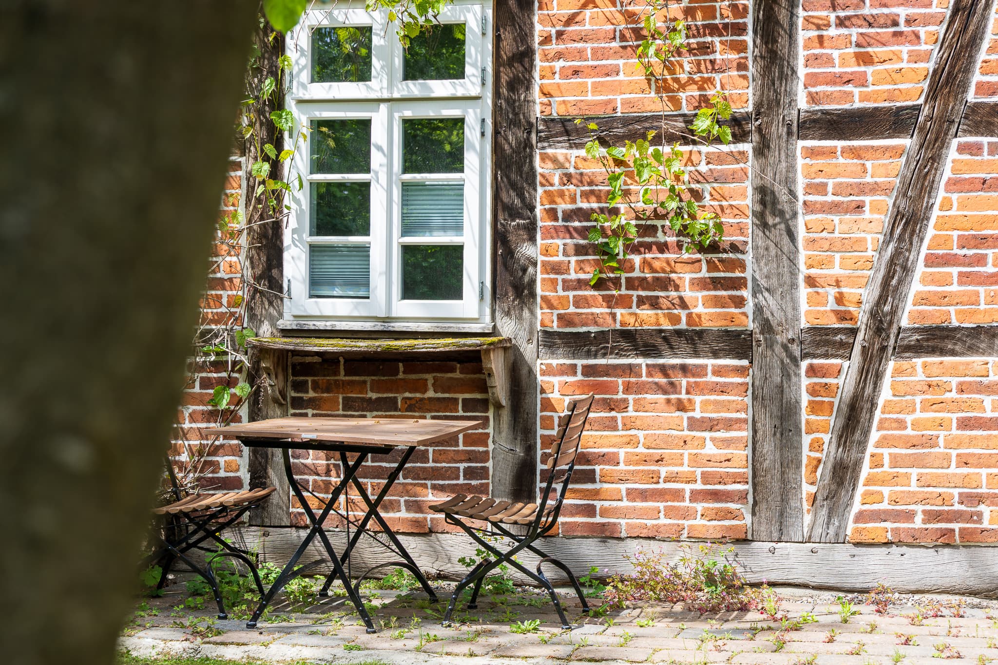 Hier genießen Sie die behagliche Atmosphäre des Fachwerkhauses mit Lehmwänden und Holzböden am einladenden Kamin. Der ruhige Garten lädt zum Entspannen ein und bietet die Möglichkeit, das Frühstück im Freien zu genießen.