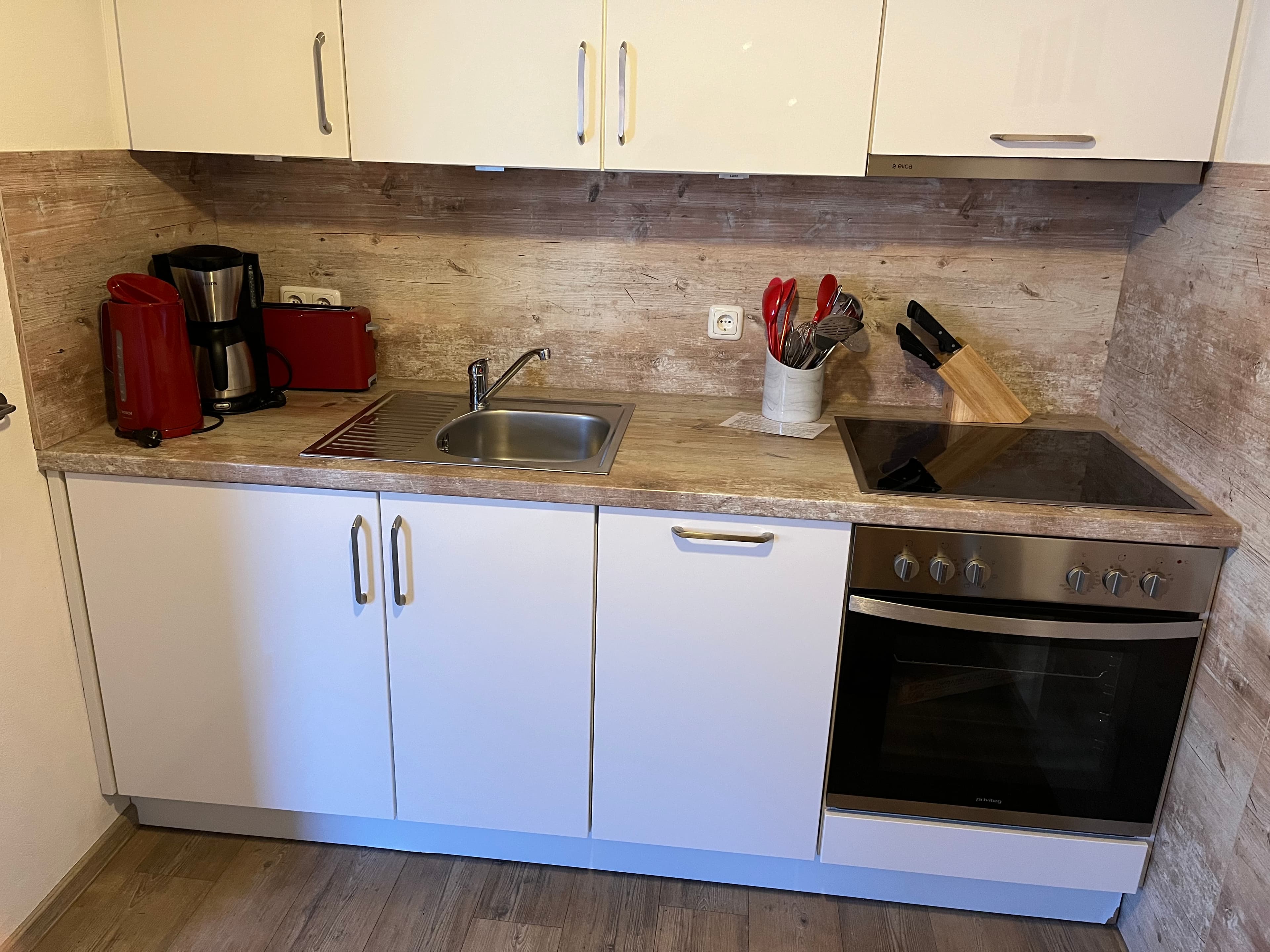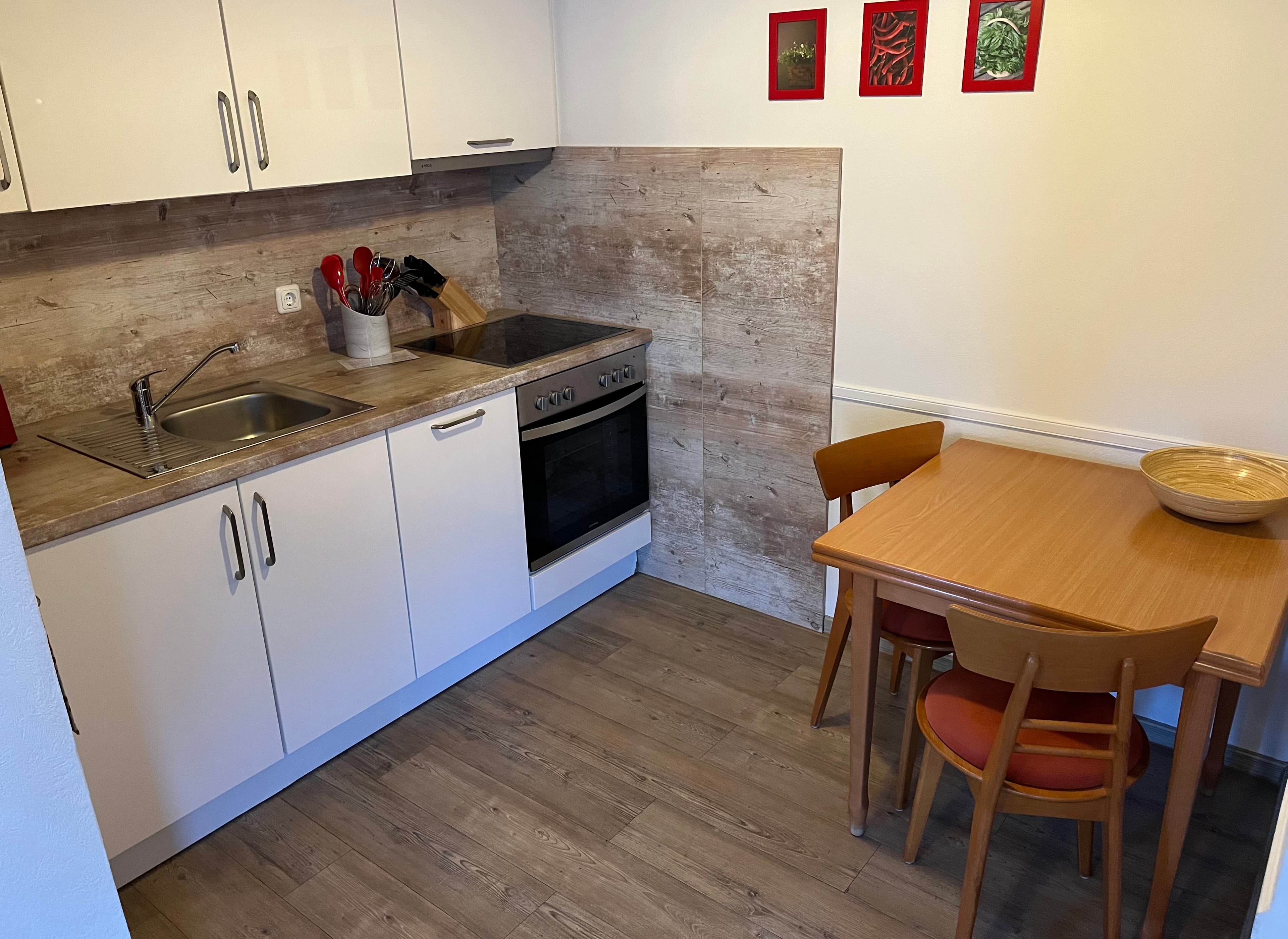 Die Einbauküche verfügt über Elektroherd mit Backofen, Wasserkocher, Toaster, ausreichend Geschirr, Kühlschrank mit Eisfach und Geschirrspüler.Gratis WLAN.