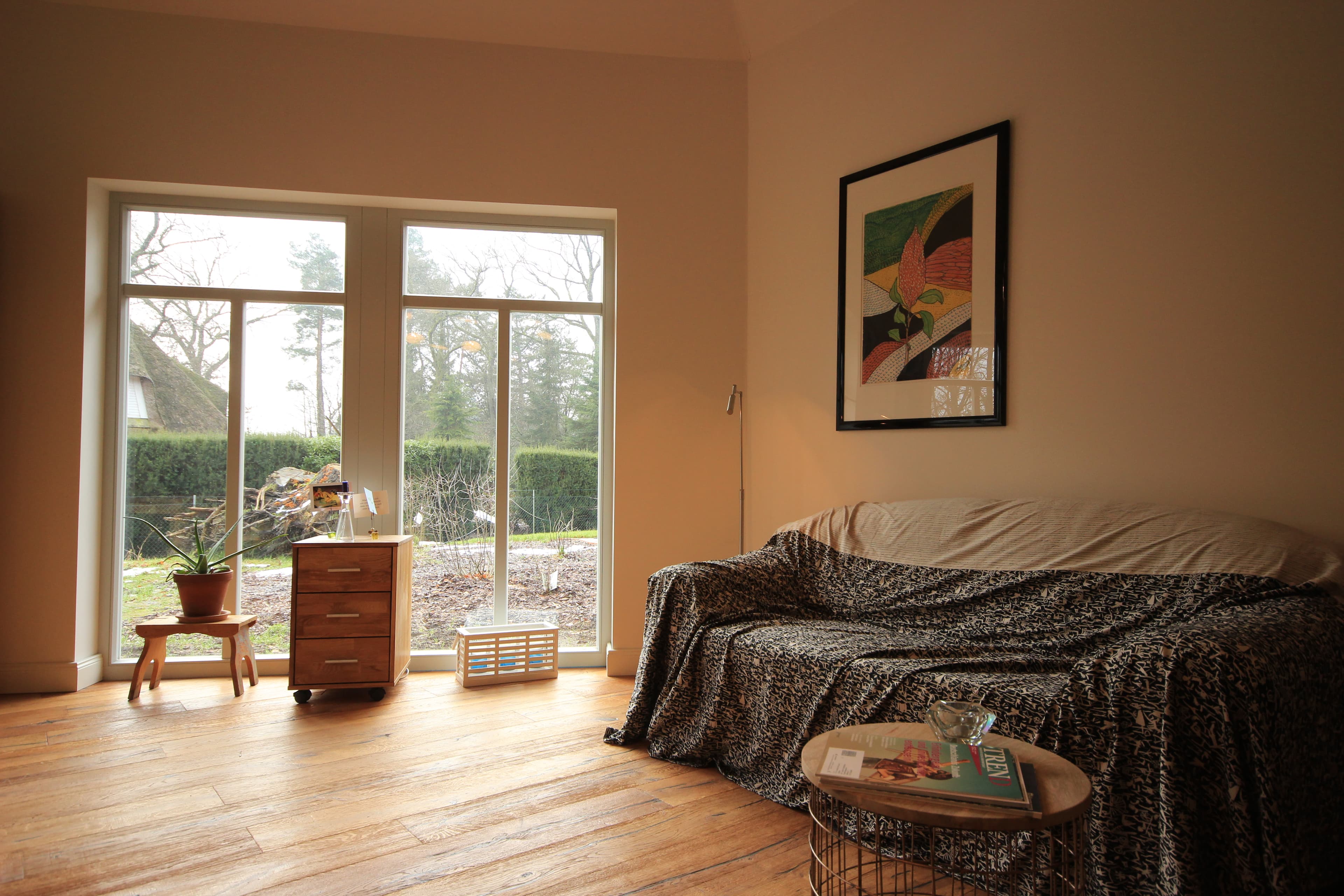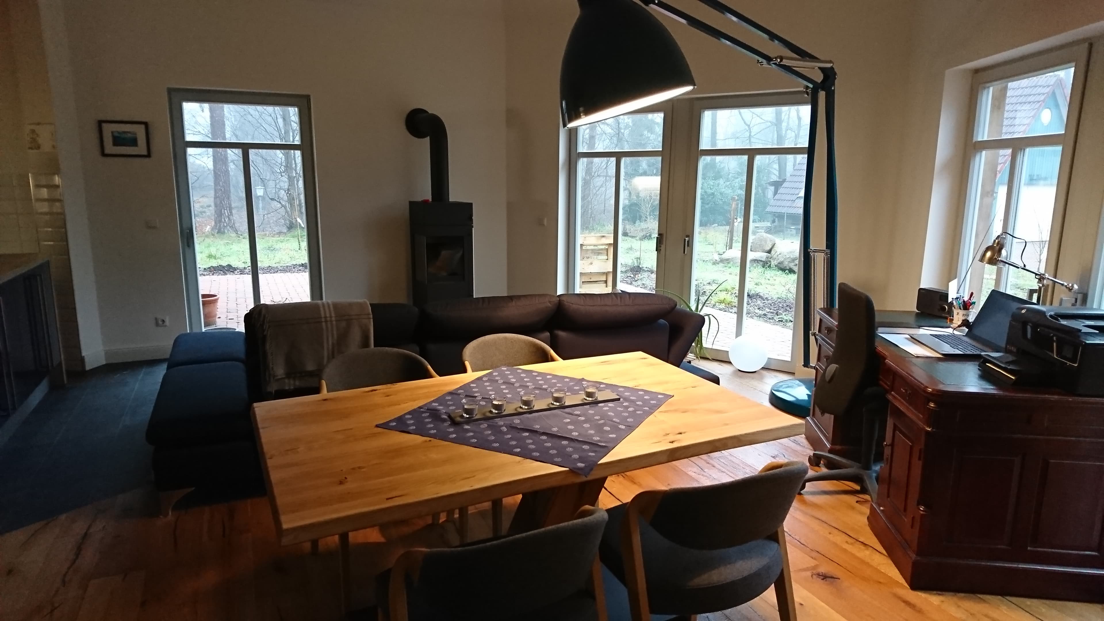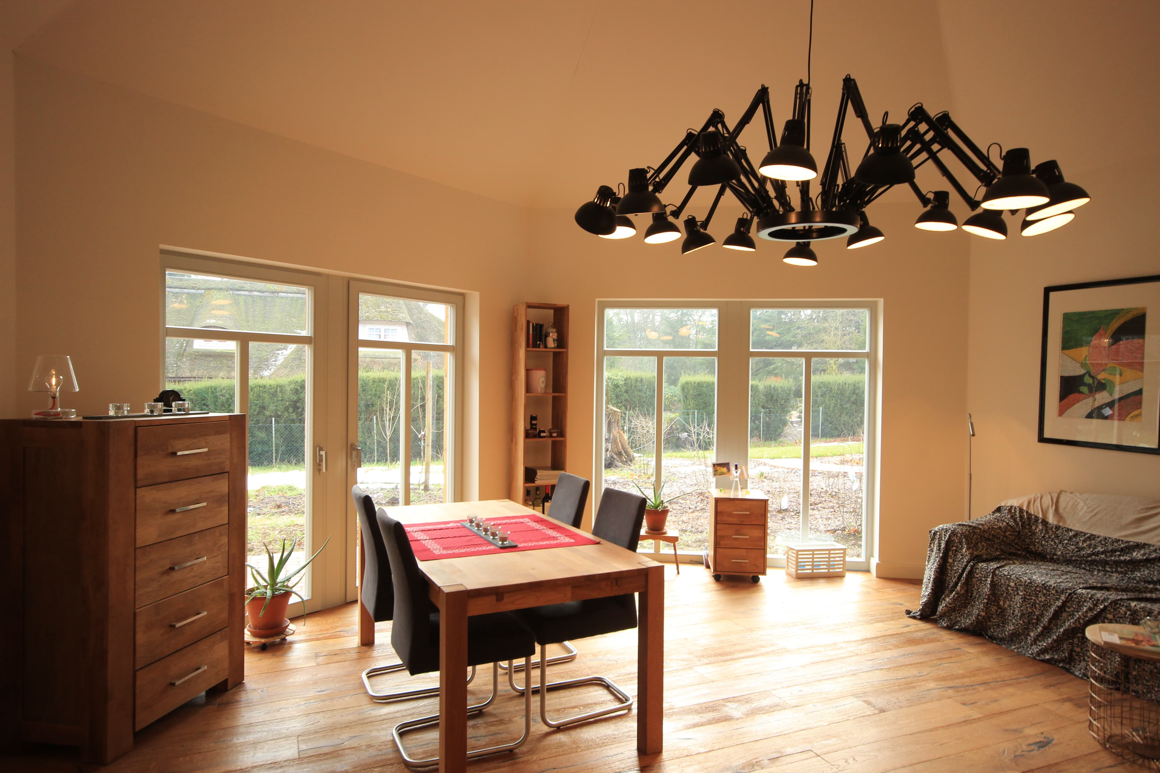 ... die mit Erdwärme betriebene Fußbodenheizung, die Auswahl schöner Materialien (z.B. das Eichenparkett, die Holzfenster, das weiche Leder der Wohnzimmersofas, die kuscheligen Wolldecken, die zarte Bettwäsche, das schöne, schlichte Rosenthal-Geschirr, die in Handarbeit im Harz hergestellten Blaudruck-Tischdecken etc.) und Designs (z.B. die Wohnzimmer-Deckenlampe in Form einer Artischocke von einem spanischen Designer).