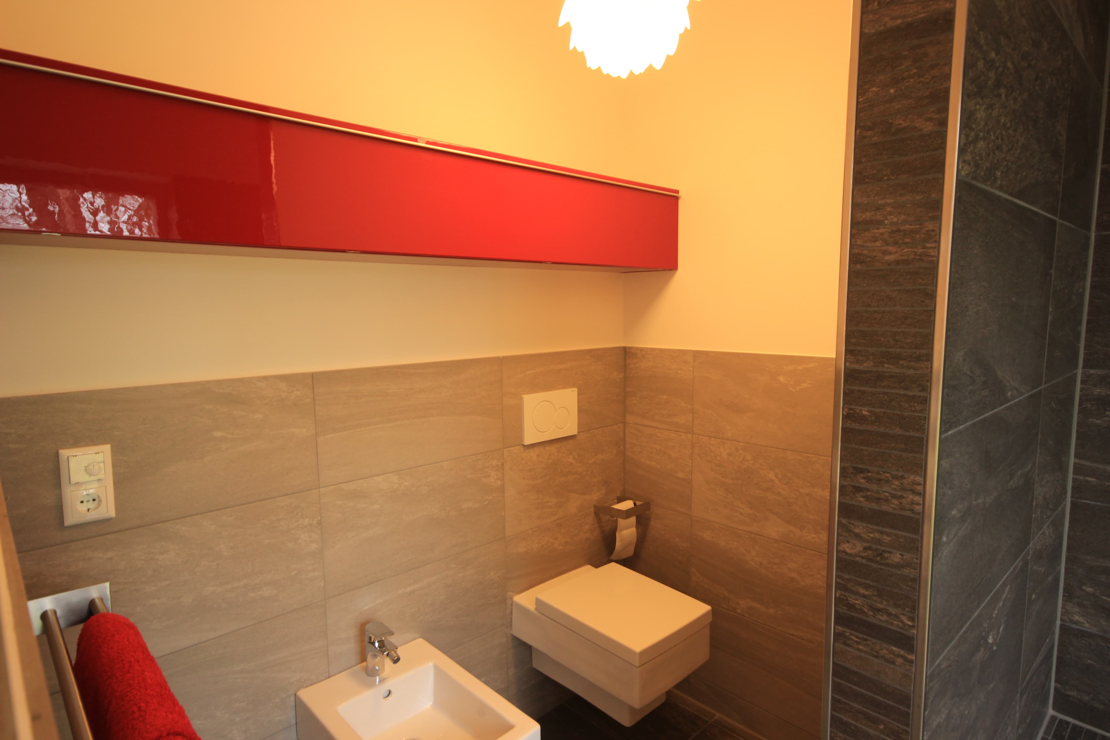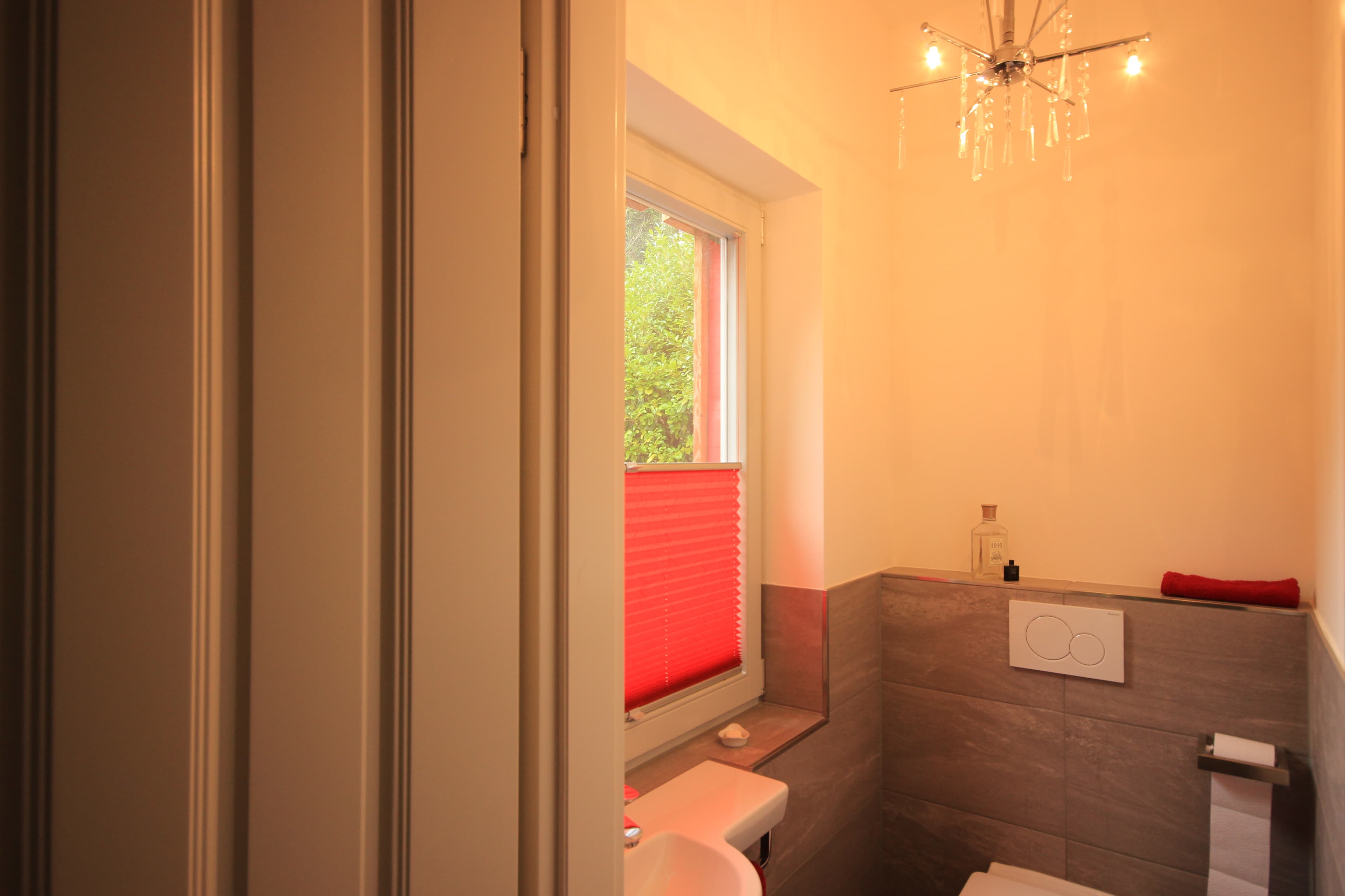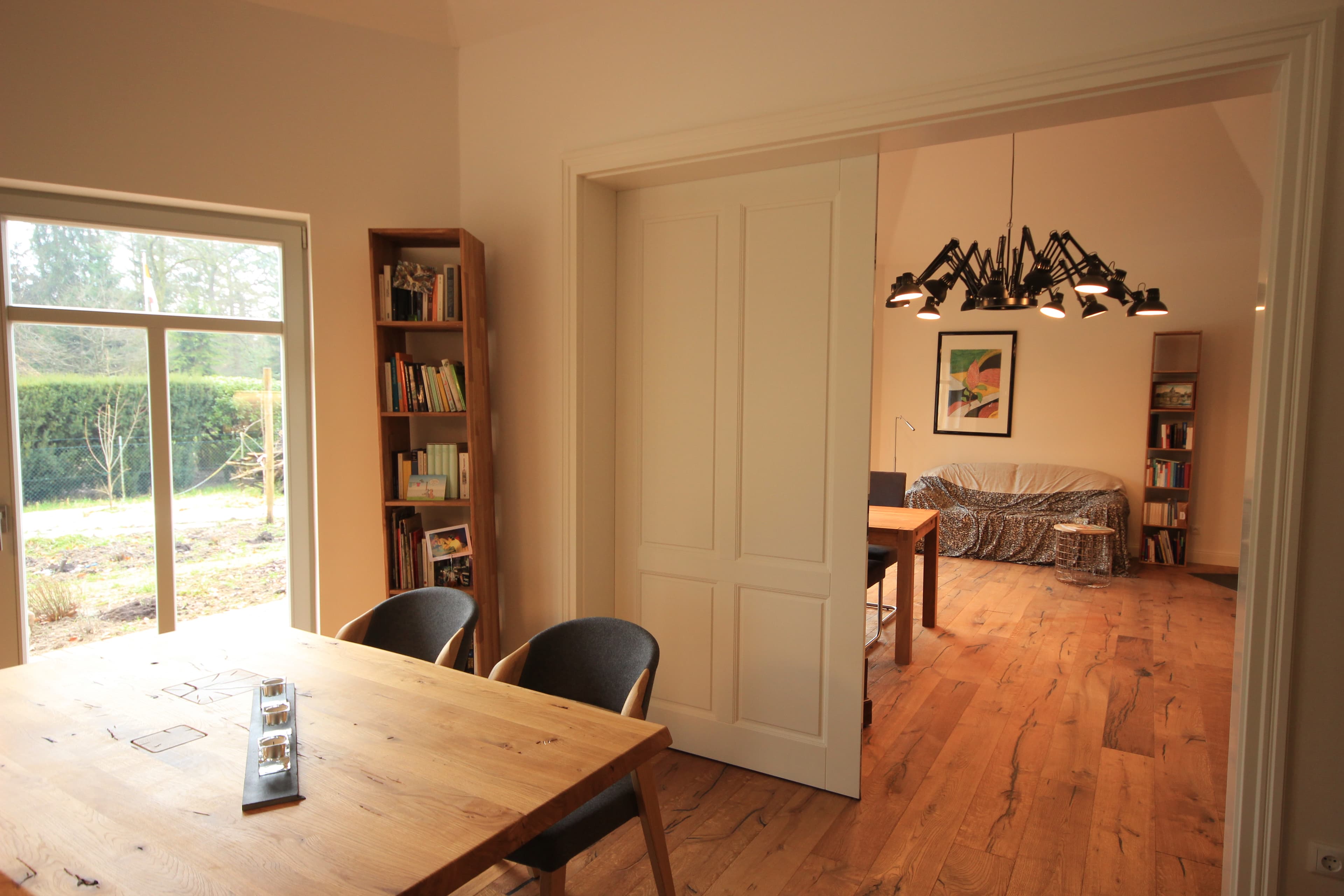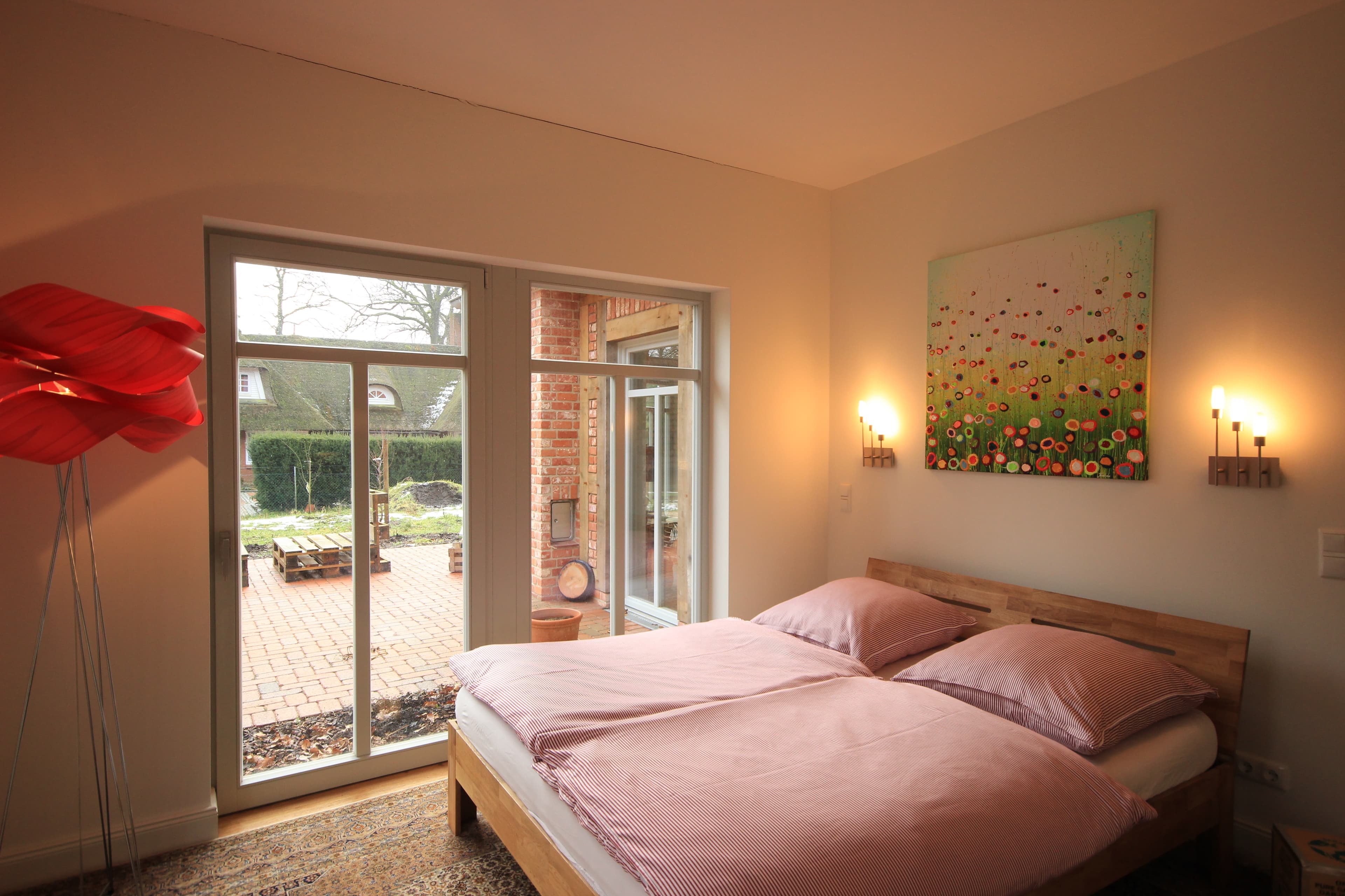 ... die mit Erdwärme betriebene Fußbodenheizung, die Auswahl schöner Materialien (z.B. das Eichenparkett, die Holzfenster, das weiche Leder der Wohnzimmersofas, die kuscheligen Wolldecken, die zarte Bettwäsche, das schöne, schlichte Rosenthal-Geschirr, die in Handarbeit im Harz hergestellten Blaudruck-Tischdecken etc.) und Designs (z.B. die Wohnzimmer-Deckenlampe in Form einer Artischocke von einem spanischen Designer).