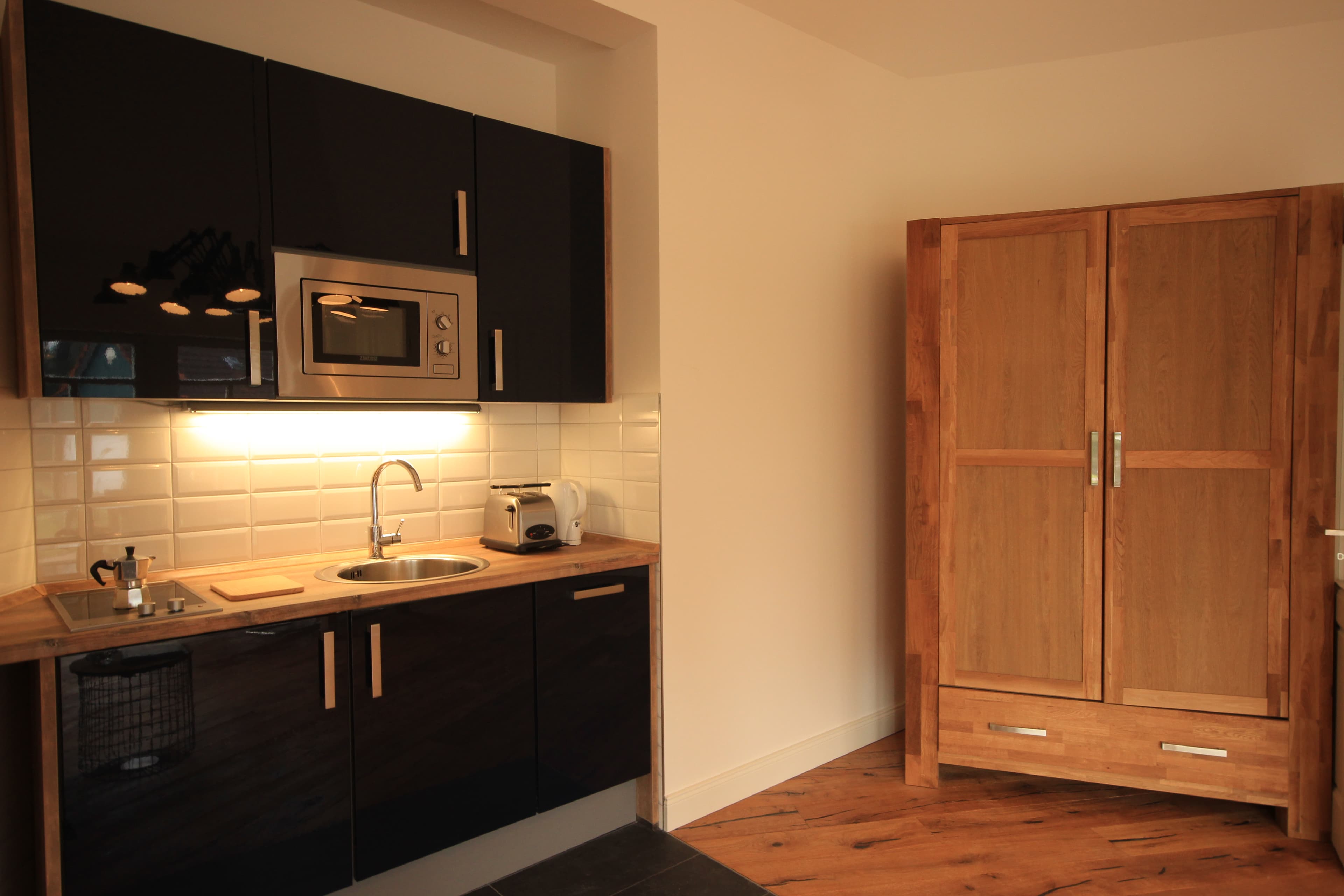 Das großzügig geschnittene Türmchenzimmer (33qm) hat durch seine Form und die Bodenfenster ein ganz besonderes Flair. Wohn-, Ess- und Schlafbereich sind integriert. Die Pantry ist mit zwei Kochplatten, eine Mikrowelle, einen Kaffeevollautomaten, Toaster, Teekocher, Geschirrspüler und kleinem Kühlschrank mit Eisfach exzellent ausgestattet. Auf der hochwertigen Schlafcouch mit Lattenrost und Federkernmatraze lässt es sich wunderbar schlafen. Diese kann tagsüber als gemütliches Sofa genutzt werden.