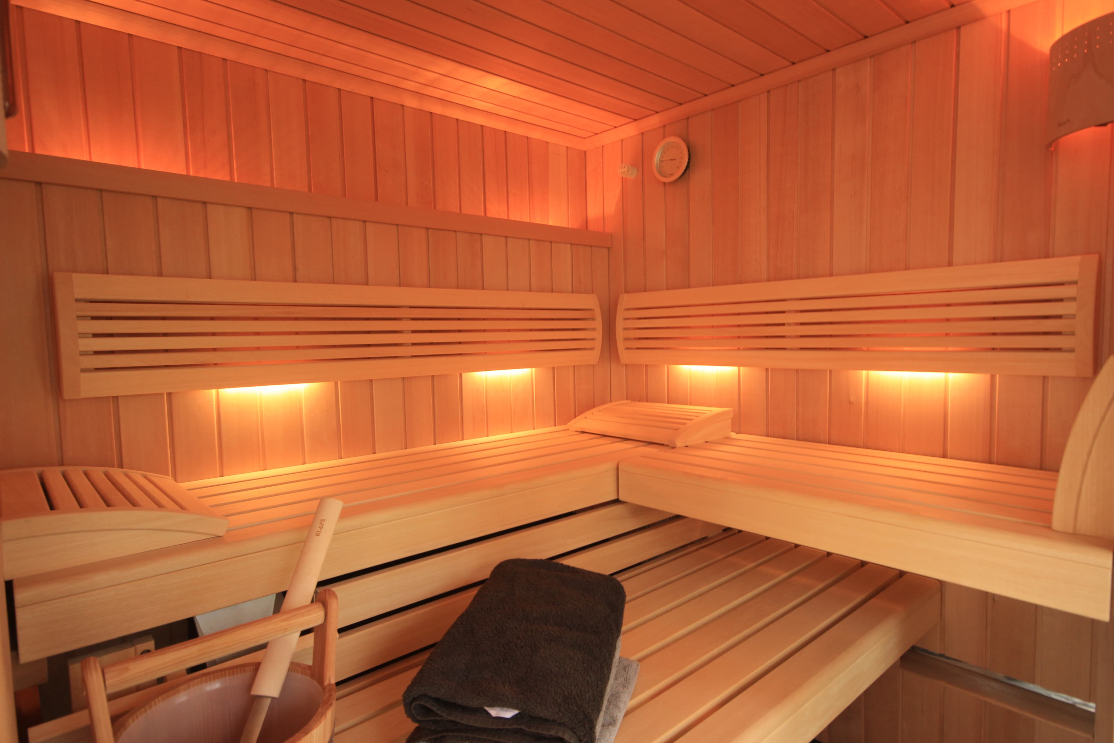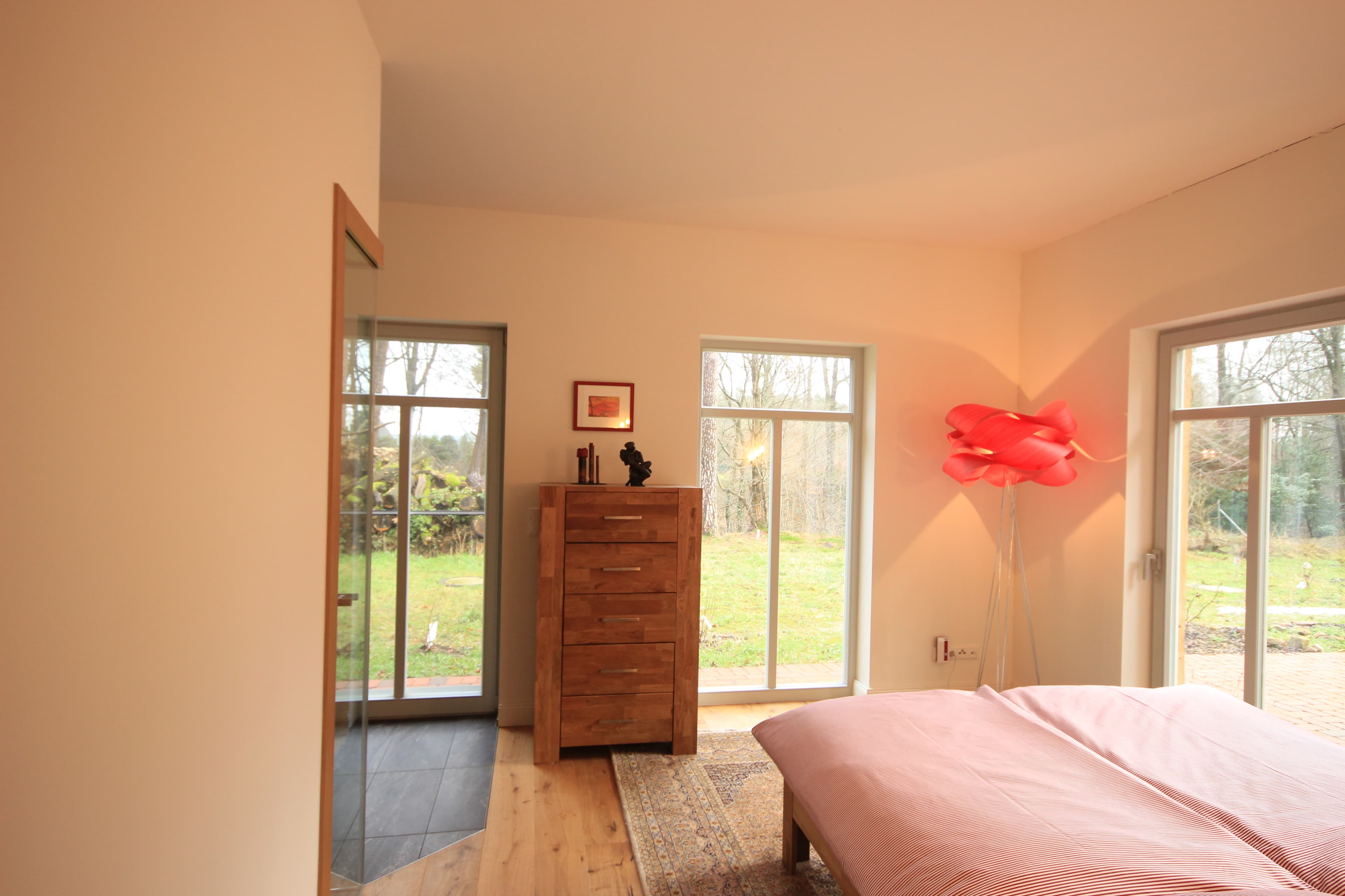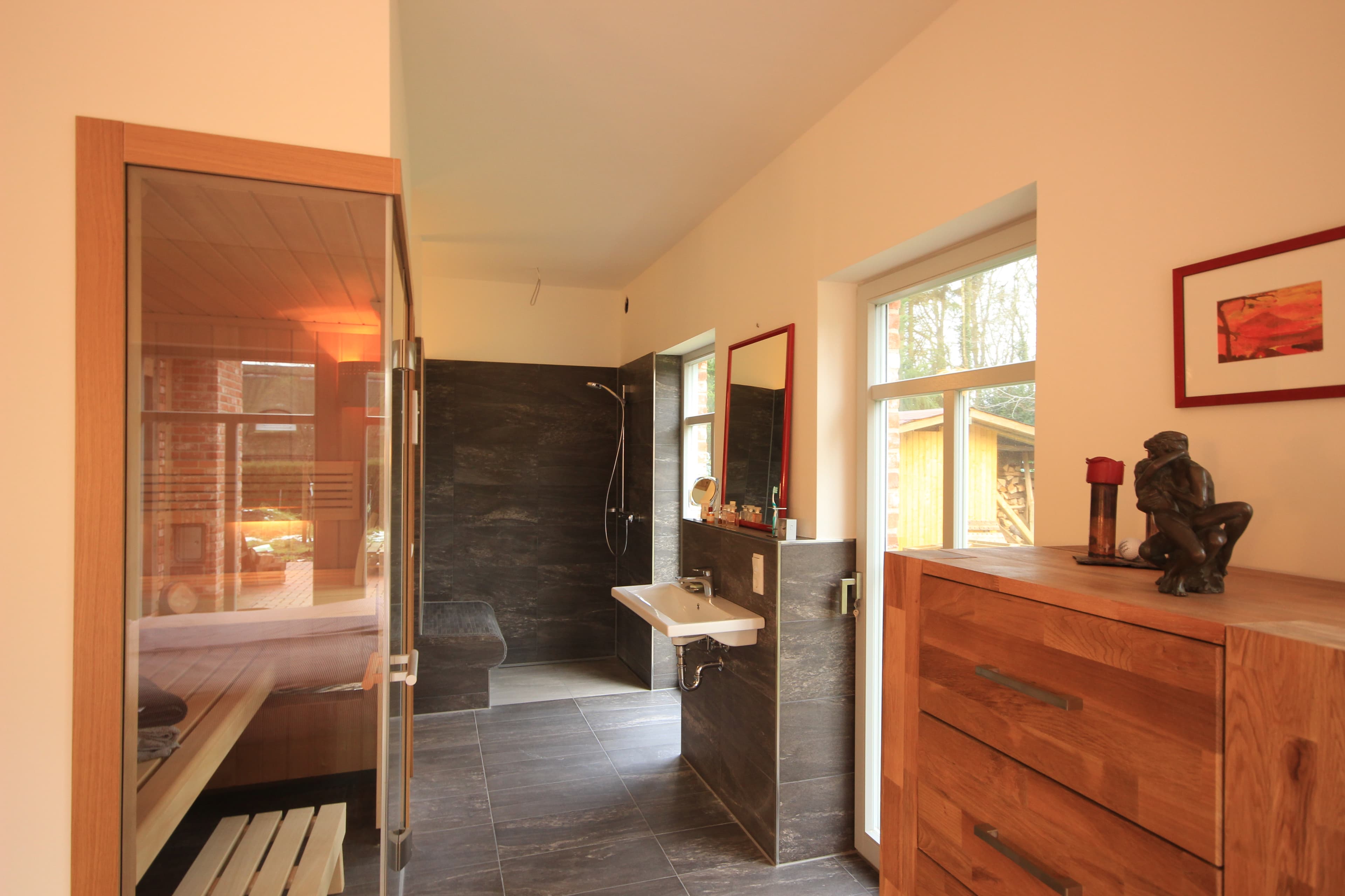 Die Besonderheit ist der großzügige Schlafzimmerbereich mit integrierter Sauna und Bad. Vom Architekten so angelegt, dass Sie durch die Glasfront der Sauna direkt in den Garten schauen... und die luxuriöse Dusche mit Sitzbank neben der Sauna haben. Es gibt ein separates Gäste WC.