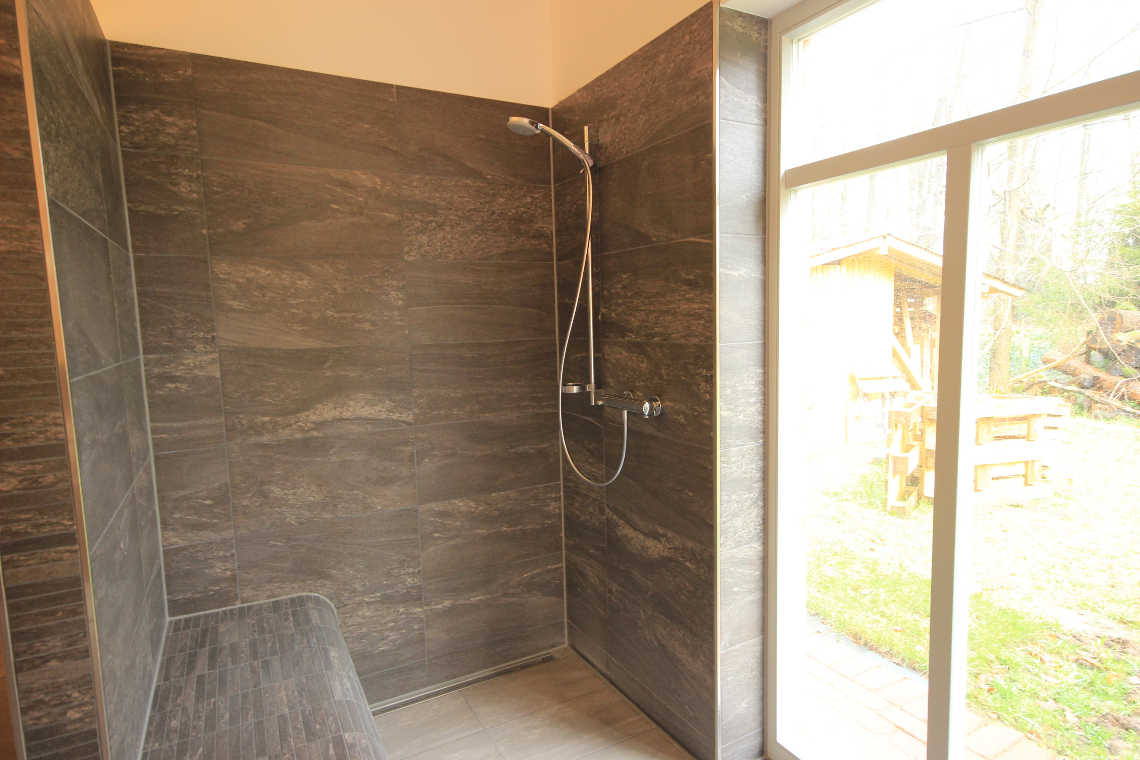 ... die barrierefreie Anlage von Haus und Garten, d.h. die ebenerdigen, großen Duschen, die Sitzbank in einem der Badezimmer, die rückenschonende Höhe von Sofas und Küche und barrierearme Bodenfenster zur Terrasse. Auch im Garten haben wir auf Treppen und Stufen verzichtet.