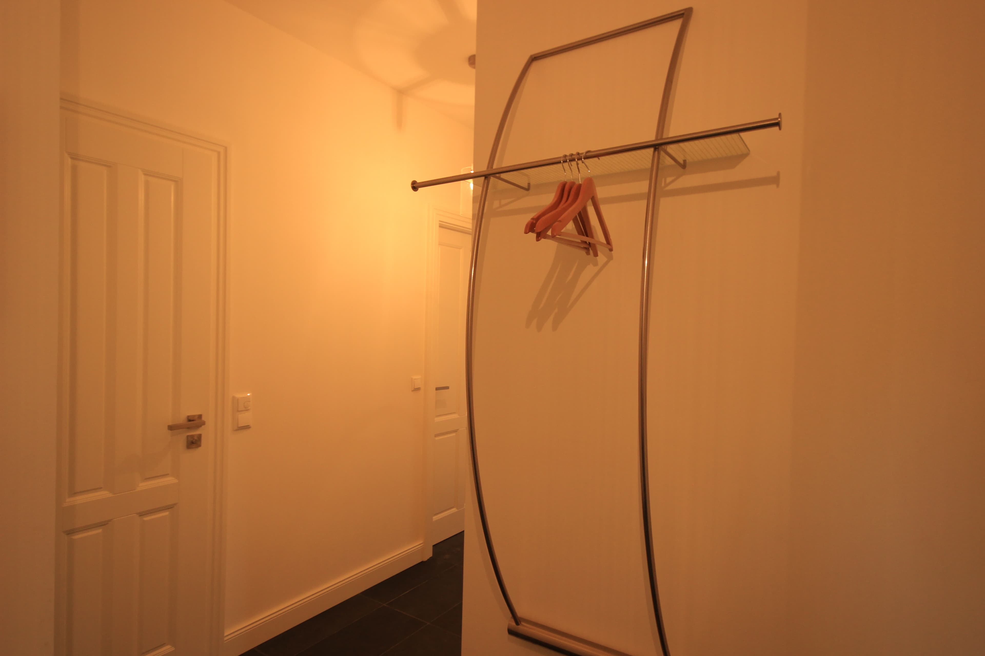 Die Wohnung hat einen Flur mit einer Garderobe und einem Schuhständer.