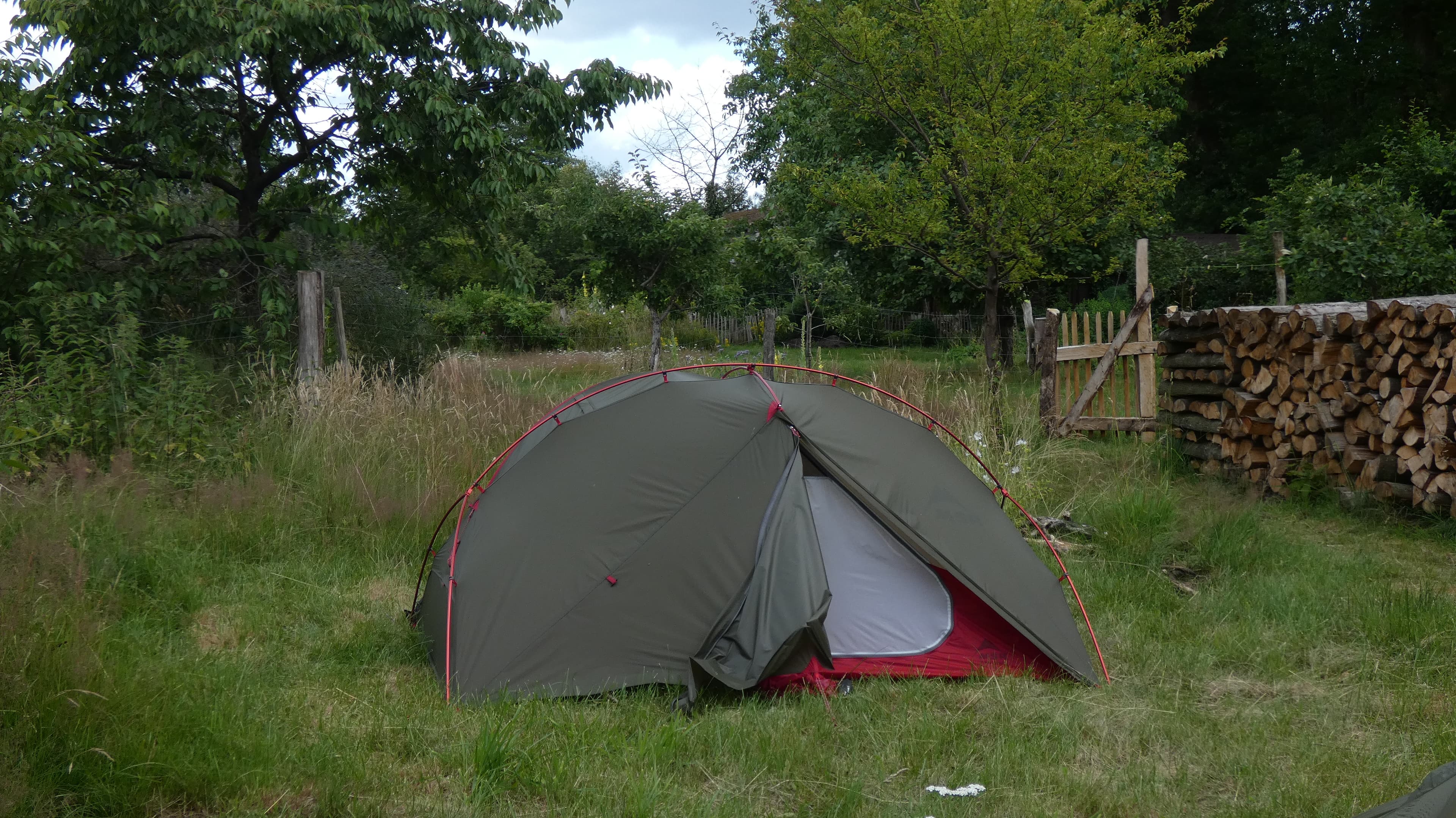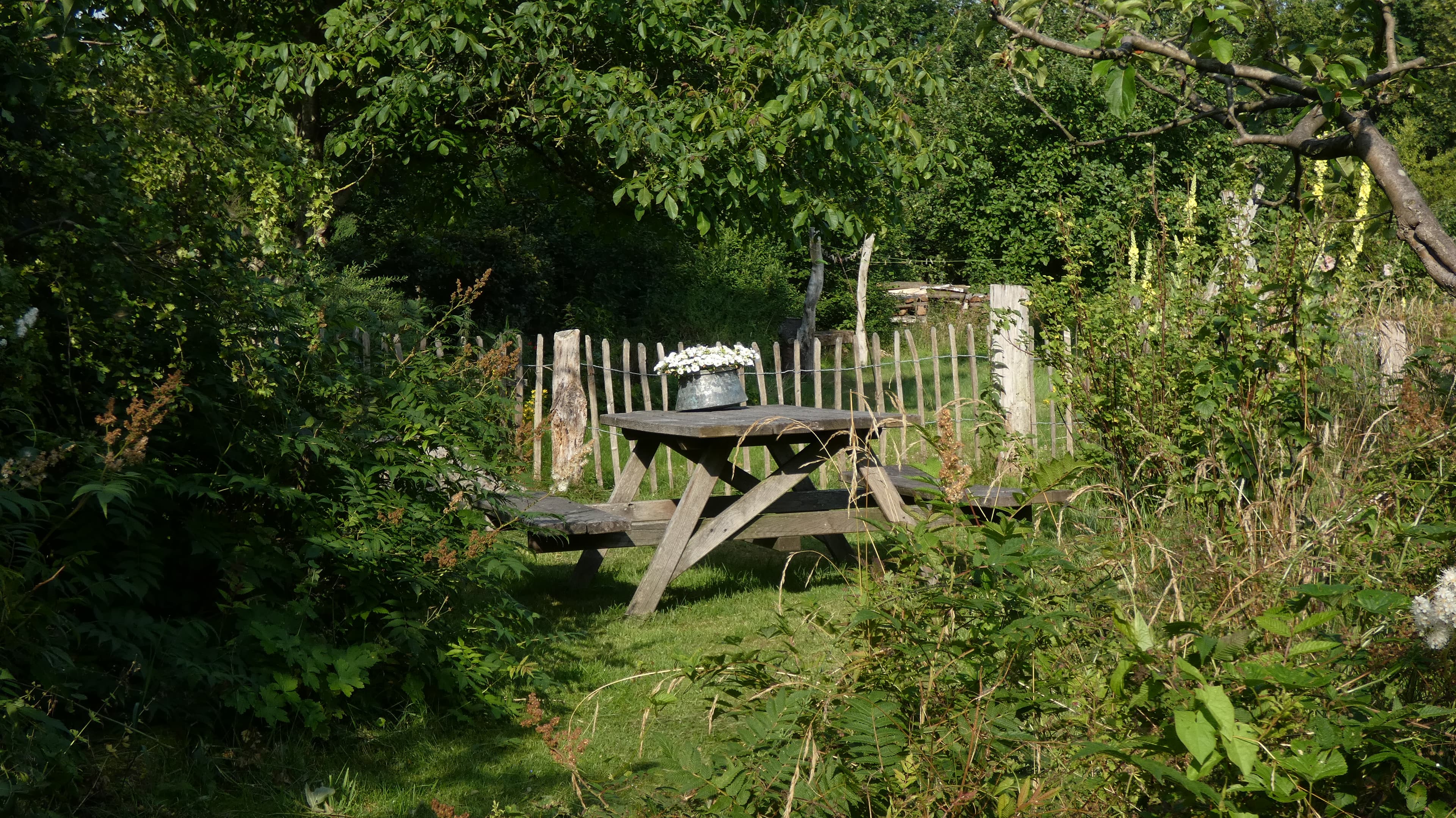 Im Garten befindet sich eine rustikale Camping-Garnitur die sich zum Rasten