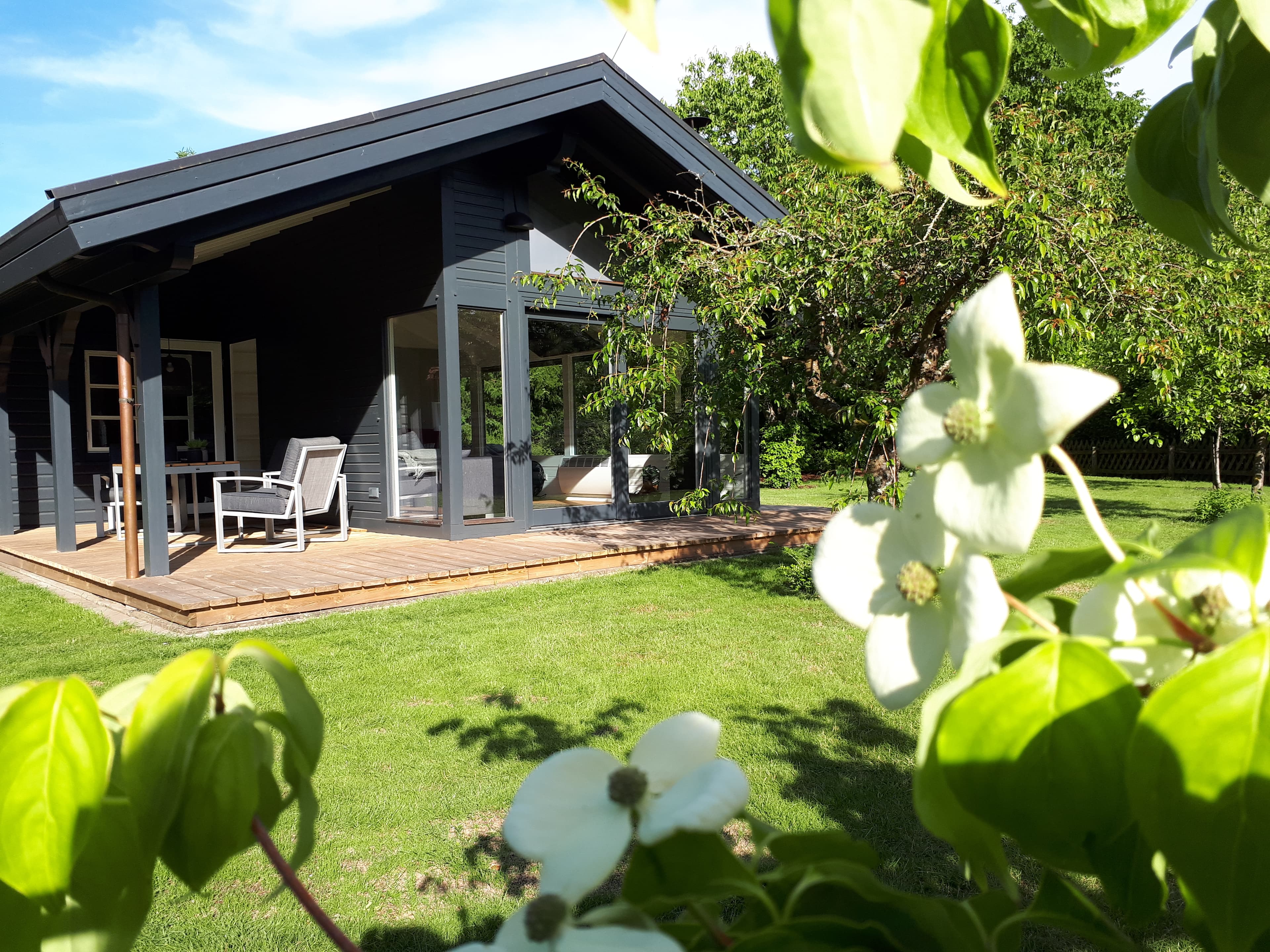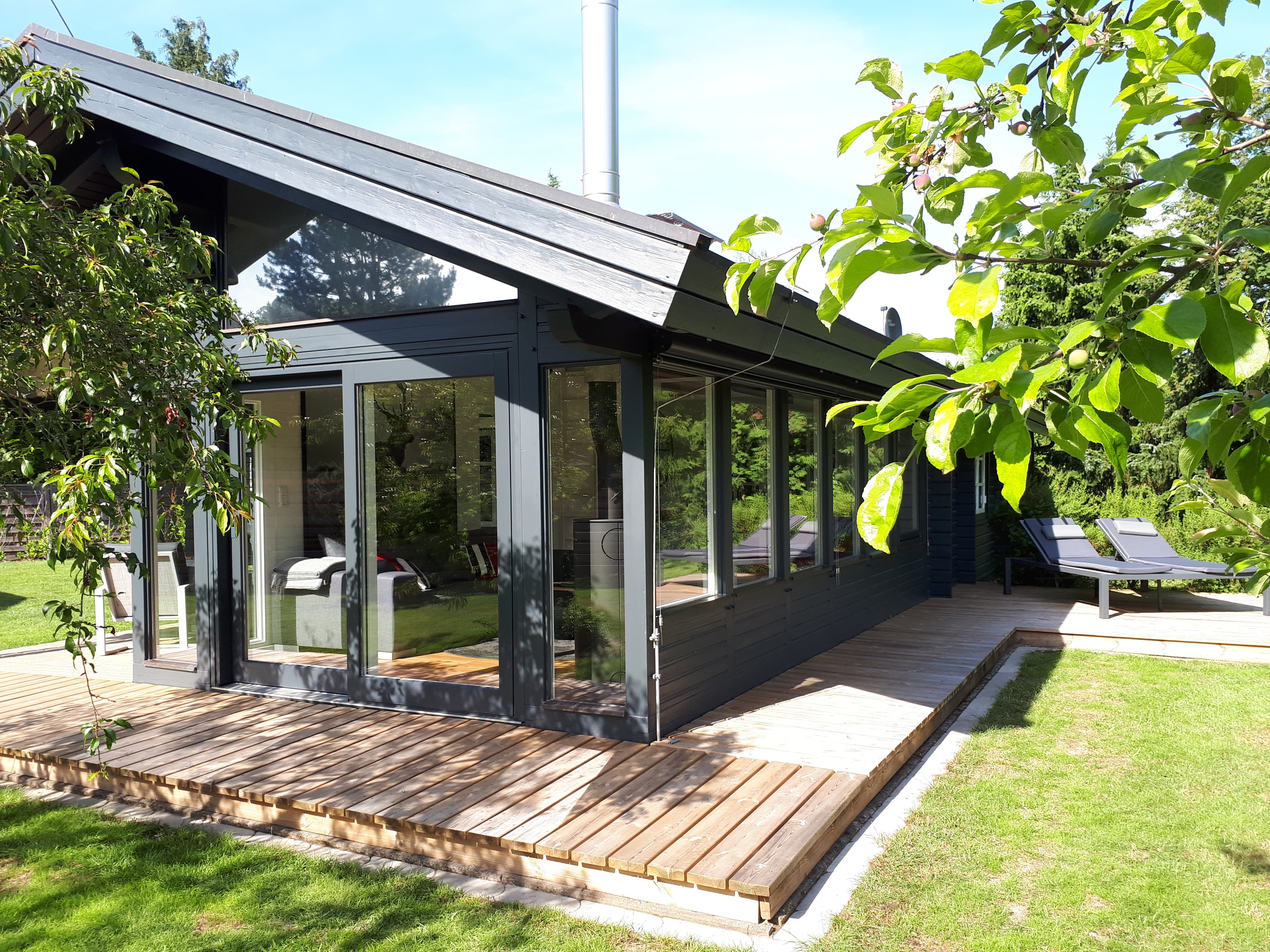 Veranda rund um den Wohnraum mit verschiedenen Sitzgelegenheiten, u.a. Liegestühlen