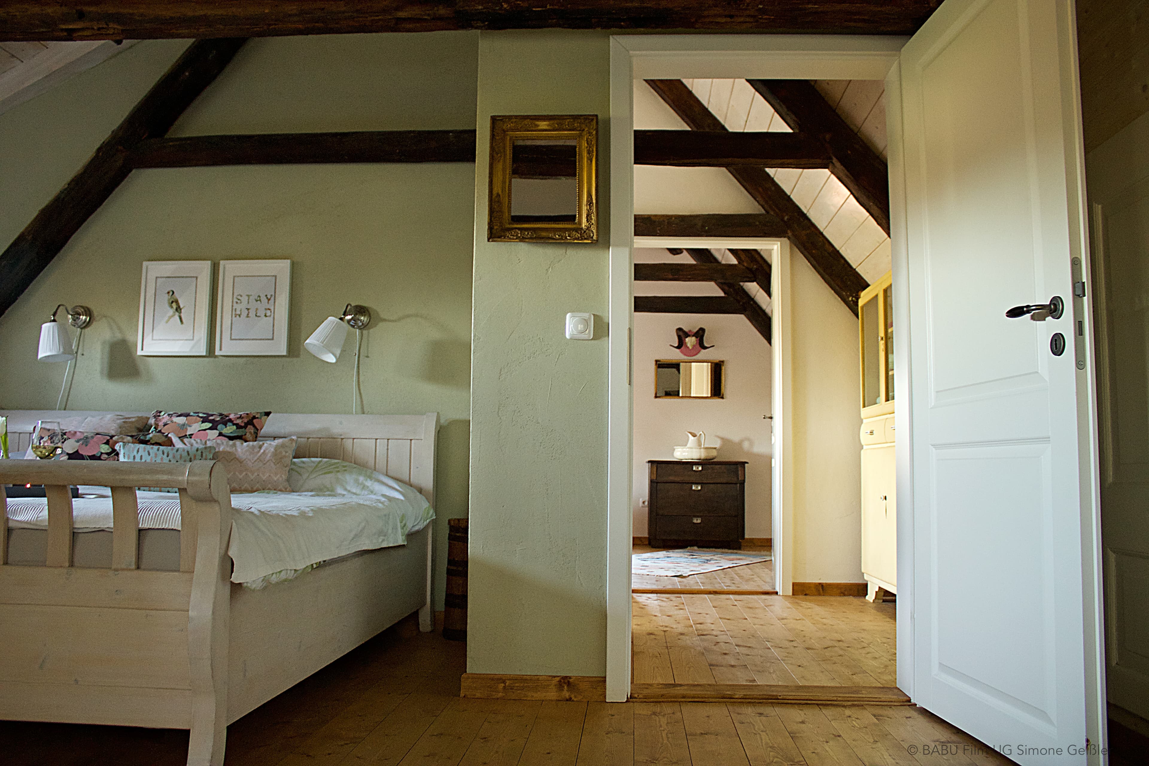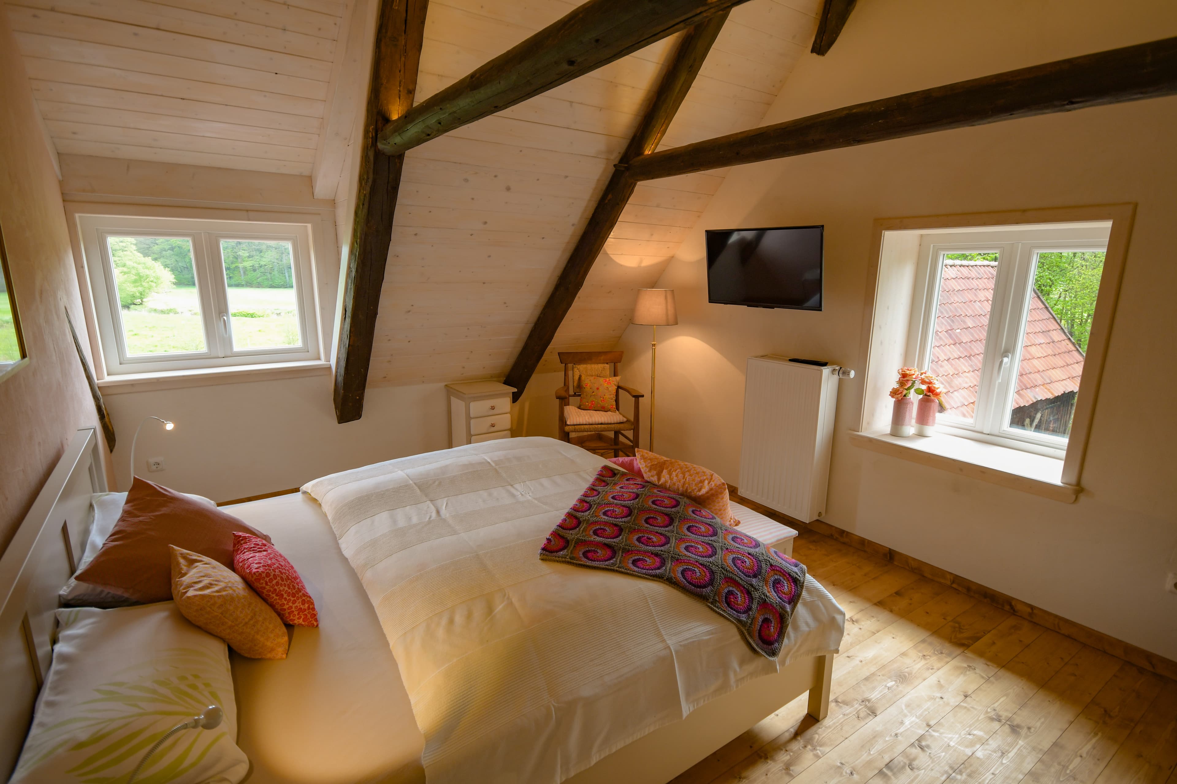 Im Obergeschoss befinden sich zwei gemütliche Schlafzimmer mit Doppelbetten und TV. Bettwäsche und Handtücher werden gestellt. Ein Zustellbett ist bei bedarf vorhanden.