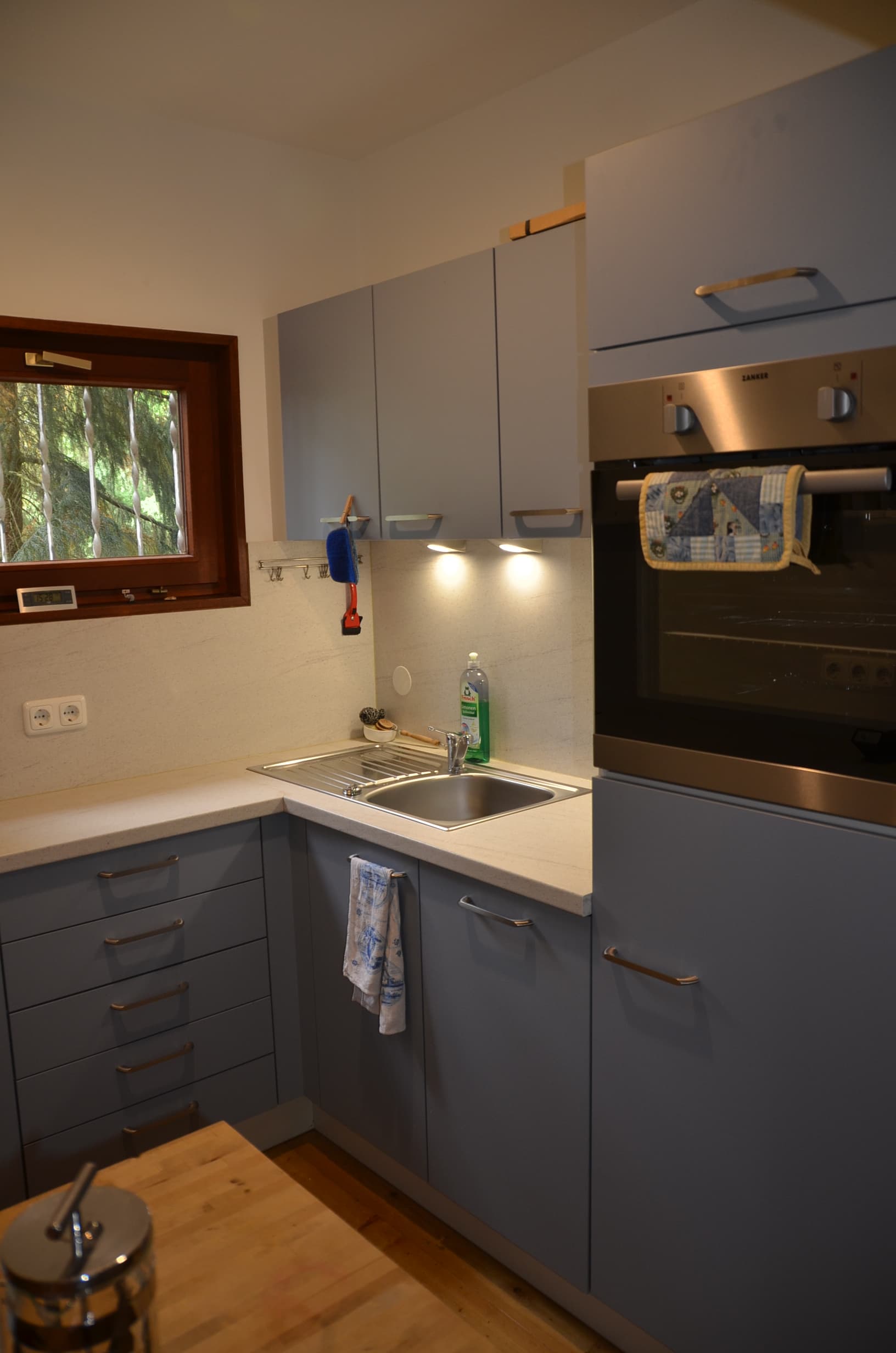 Die offene Küche (4qm) bietet ausreichend Platz, um Mahlzeiten vorzubereiten. Sie ist ausgestattet mit einer Spüle und Spülmaschine, Kühlschrank mit Gefrierfach, Backofen, Kaffeemaschine, Wasserkocher, zwei Platten Ceranfeld, Toaster, sowie Geschirrtüchern, Wischlappen, Reinigungsmittel für die Spülmaschine. Ausreichend Töpfe, Pfannen, Geschirr, Besteck, Tassen und Gläser sind vorhanden.