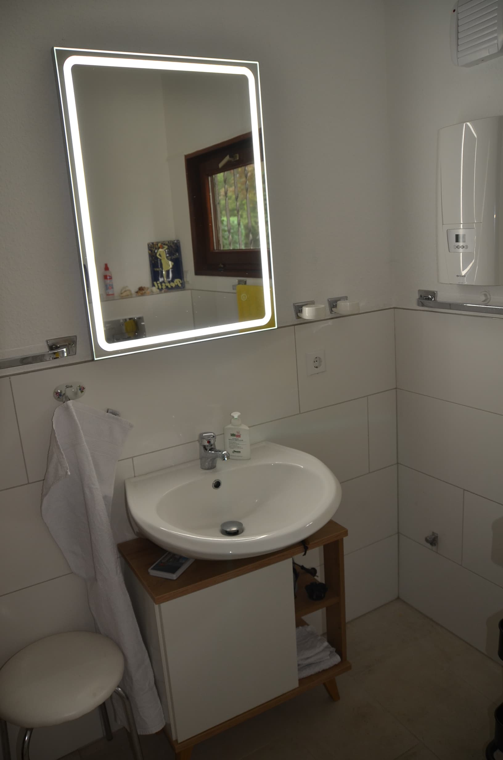 Das Badezimmer (4qm) hat eine ebenerdige Dusche, Waschbecken mit Spiegel, WC, Lüfter, Hocker, Fön und eine elektrische Fußbodenerwärmung.