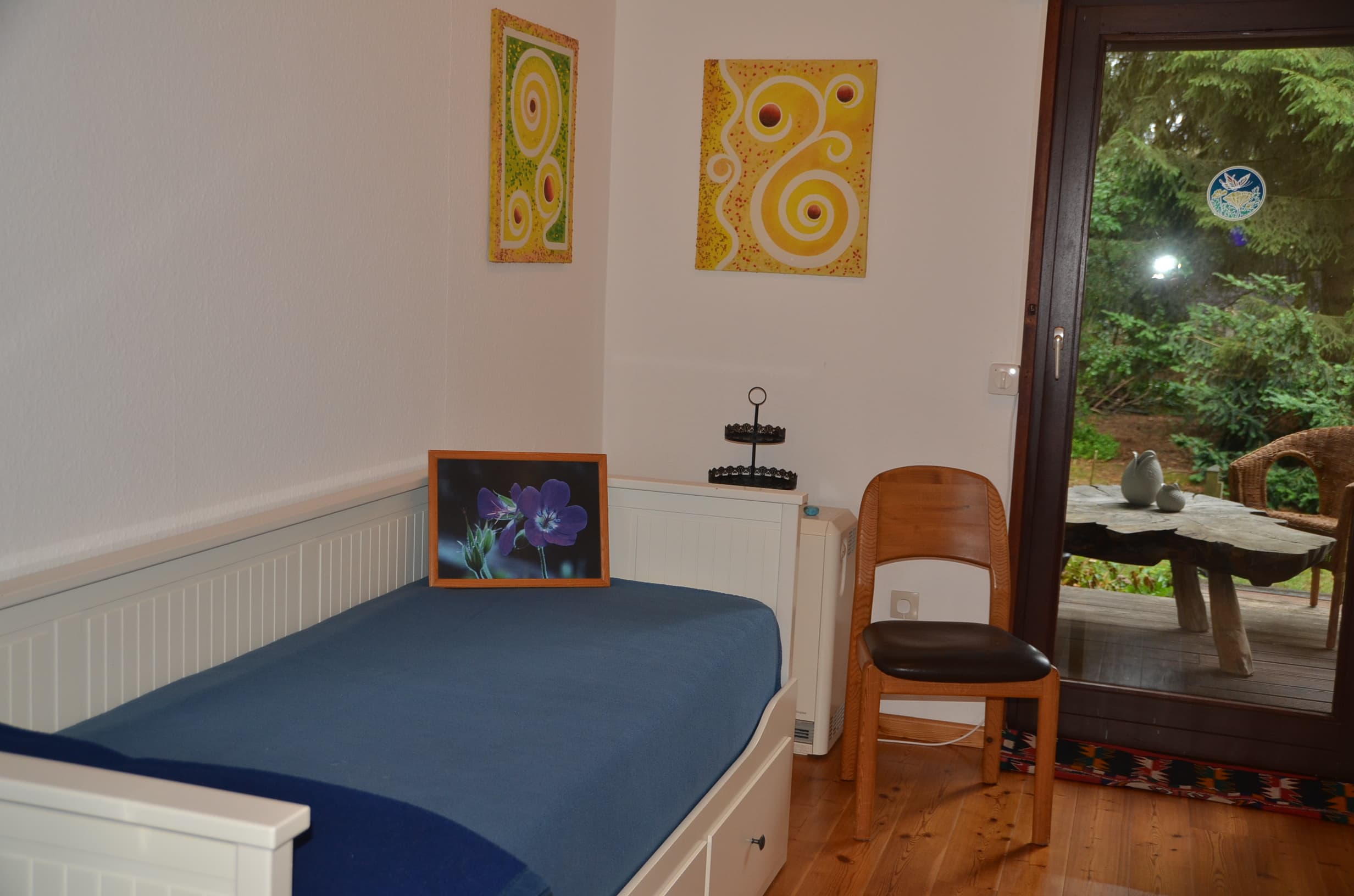 Das andere Zimmer (12qm) hat ein Kojenbett (80x200), welches bei Bedarf auf 160 cm ausgezogen werden kann. Es gibt ein Bücherregal, eine Leselampe, einen Sessel, einen kleinen Tisch, und eine offene Kleideraufbewahrung zum Hängen ihrer Garderobe.