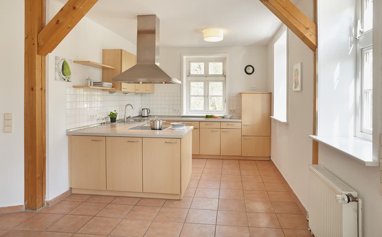 127 QM für bis zu 6 Personen. 3 Schlafzimmer, ca. 200m vom Haupthaus des Gutshofes entfernt, 2 Bäder (1x Badewanne, 1x Dusche), Wohnküche mit Esstisch, Fußbodenerwärmung, Terracottafliesen und offene Ständerbalken, Holzdielen im 1. Stock.