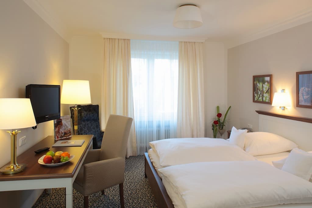 Unsere Classiczimmer (Standard) befinden sich im Stammhaus und bieten mit Ihren 21 m² Platz für 2 Personen. Die Zimmer überzeugen durch die sonnig-helle Einrichtung, unsere komfortablen Doppelbetten und das modern gehaltene Badezimmer mit Badewanne oder Dusche.