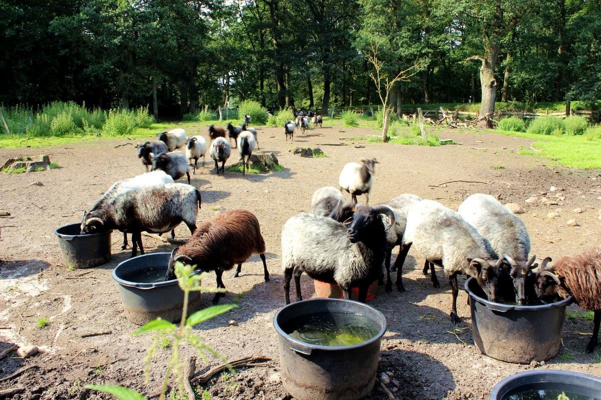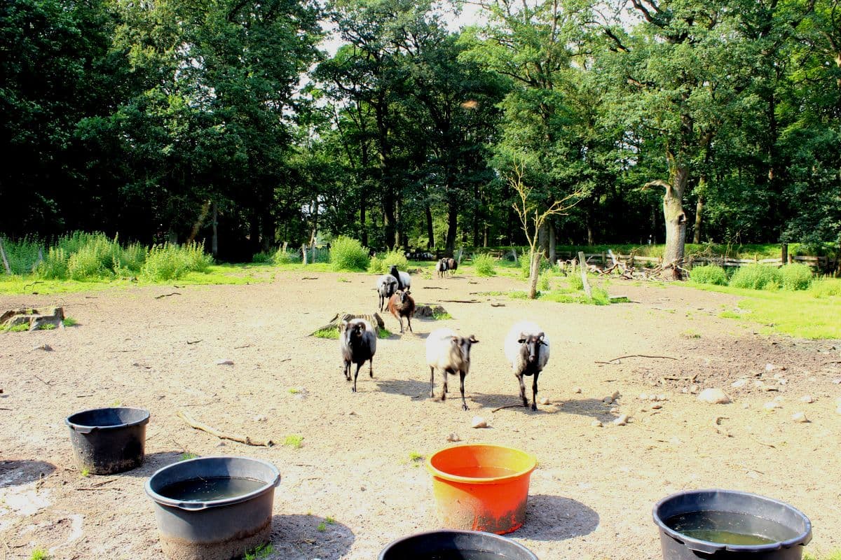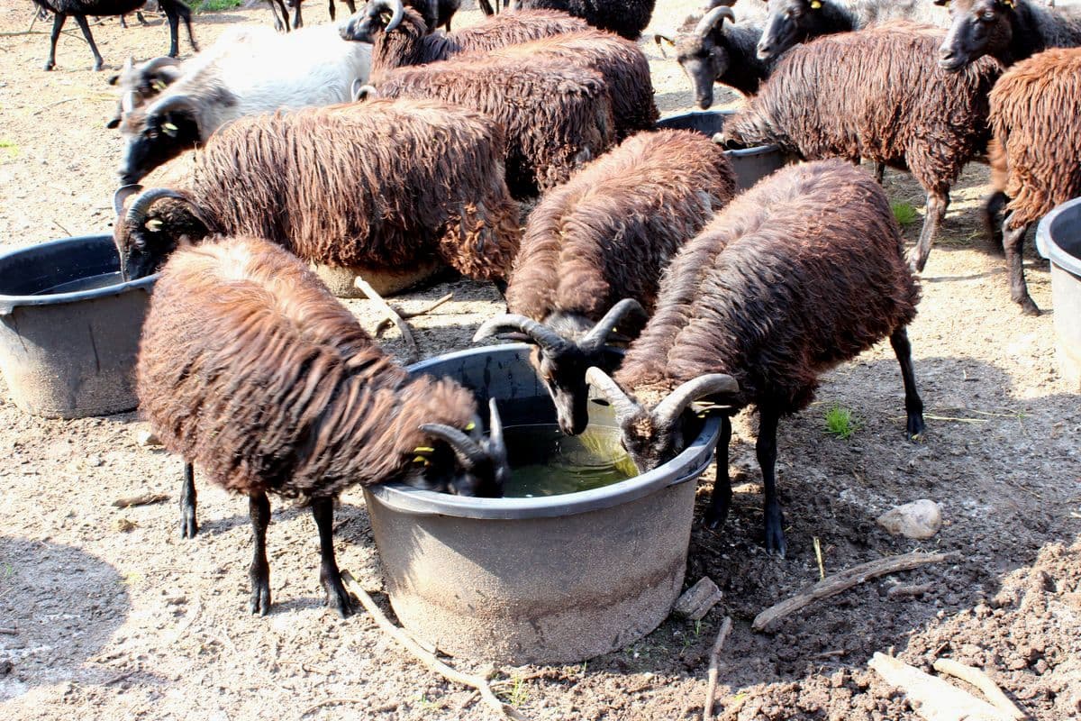 Gespannt gehen wir zum Pferch als wir schon das Mähen der Herde hören können. Im Galopp kommen die Schnucken auf uns zugerannt. Schnell erkennen wir jedoch, dass nicht wir, sondern die kühlen Wasserkübel die Tiere anlocken.