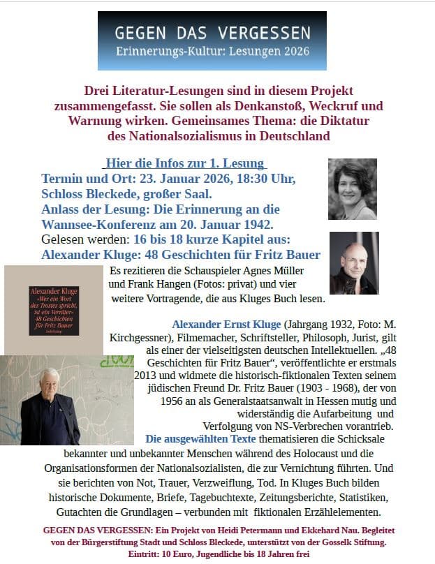 BleckedeAb demDie Lesung sol als Denkanstoß, Weckruf und Warnung wirken. Thema: die Diktatur des Nationalsozialismus in Deutschland
