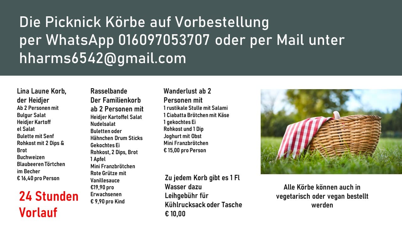 EINMALIG ABER sind unsere PICKNICKKORB IDEEN für Ihre Wanderung oder einfach Ausflug in der Lüneburger Heide: Binnen 24 Stunden nach Ihrer Bestellung sind diese abholbereit. Ob mit oder ohne Fleisch, ob herzhafte Stullen, Salate, klassische Frikadellen, Käse und Oliven...abgepackt in leichten Kraftpapier Gefäßen, um leichtes Gespäck zu sein oder aber stilecht in Weckgläsern. Wir haben die Ideen für Ihren Proviant Bedarf.