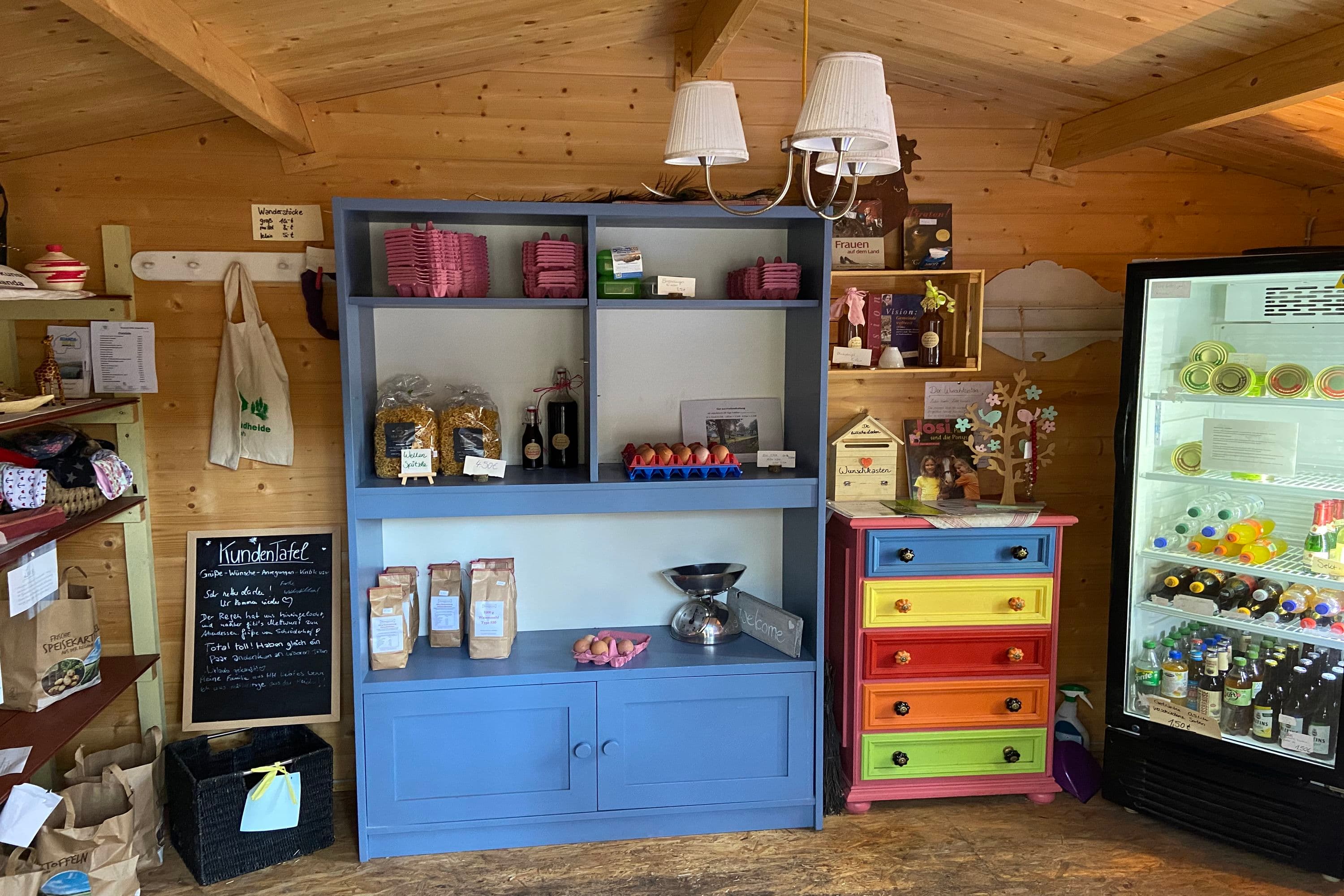 einen kleinen Selbstbedienungsladen zu eröffnen, in dem Heidegäste, die z.B. auf dem Heidschnucken Wanderweg bei uns vorbeikommen oder unsere Feriengäste sich möglichst mit regionalen Produkten versorgen können.