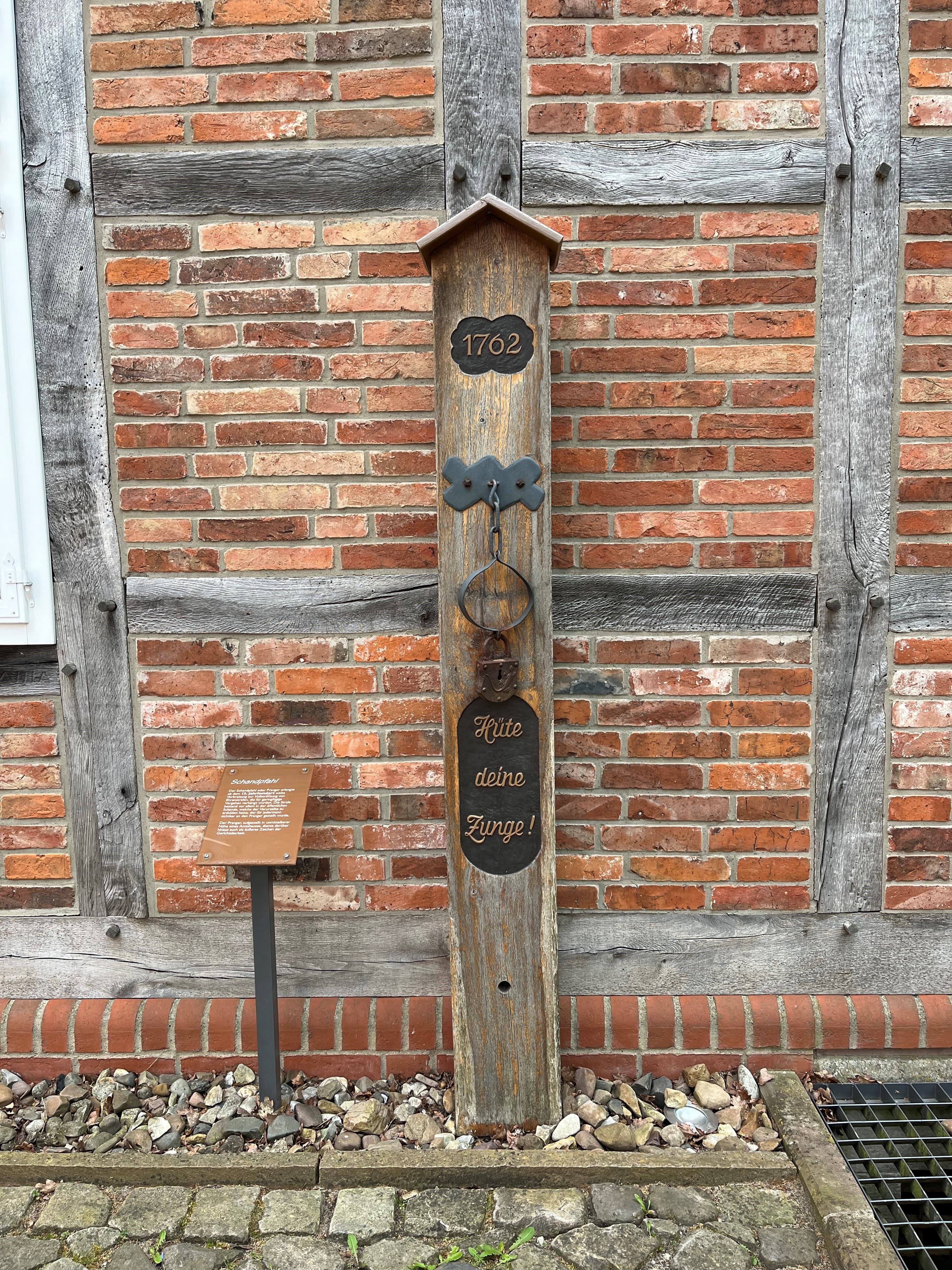 An der Giebelseite des Hauses wurde der Nachbau eines Prangers aufgestellt. Der Schandpfahl oder Pranger erlangte ab dem 13. Jahrhundert weite Verbreitung zur Vollstreckung von Ehrenstrafen, die für geringfügige Vergehen verhängt wurden. Die Strafe bestand vor allem in der öffentlichen Schande, welche der Verurteilte zu erdulden hatte, der für jedermann sichtbar an den Pranger gestellt wurde. Der Pranger, aufgestellt in unmittelbarer Nähe eines Amtshauses, diente als äußeres Zeichen der Gerichtsbarkeit.