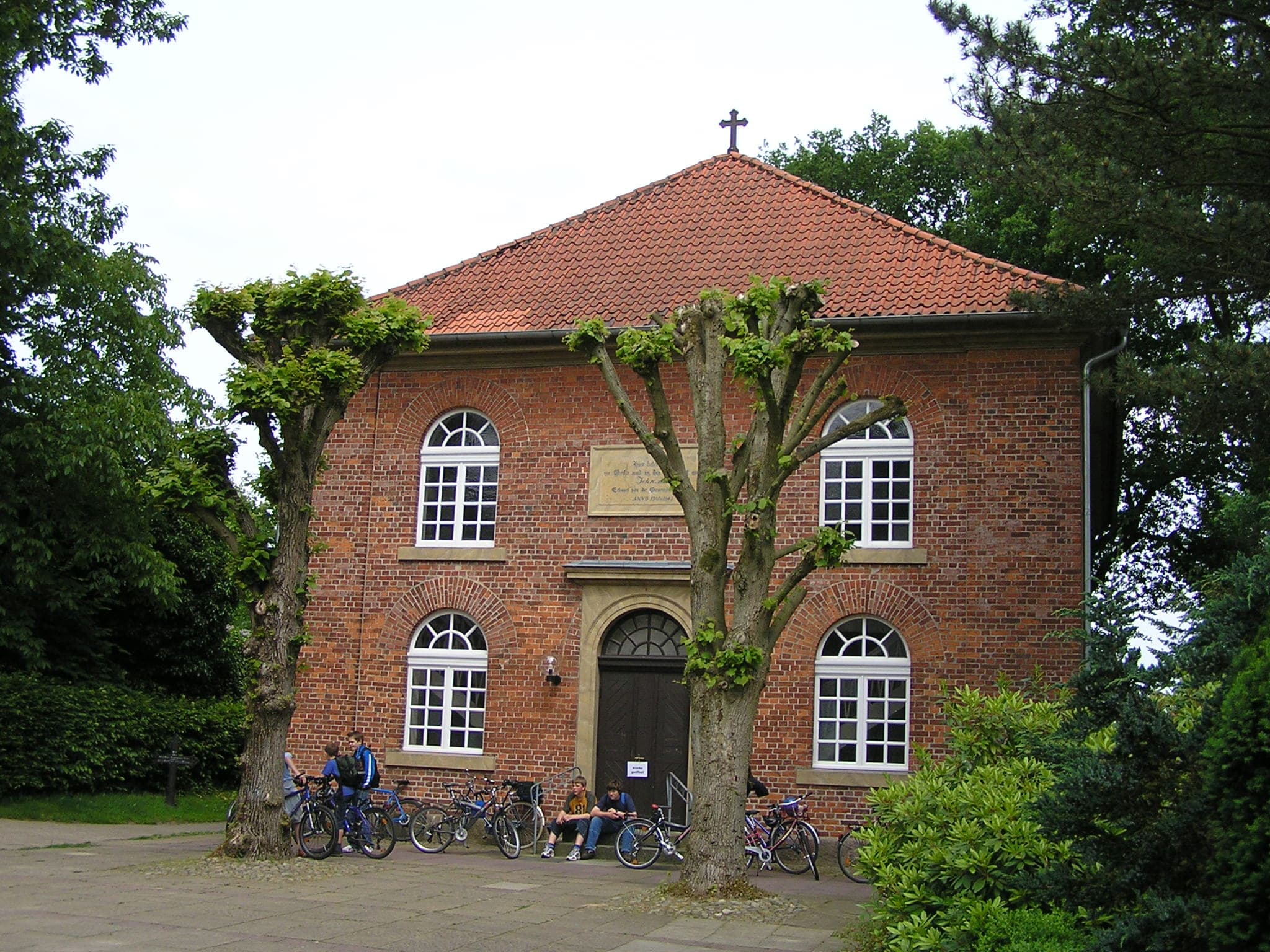 Der einfache kubische Baukörper aus unverputztem Ziegelstein und einem Pfannen gedecktem Dach weist vier auf drei Fensterachsen auf. Er ist 19,8 Meter lang und 12,8 Meter breit. Die Höhe bis zur Traufe beträgt 7,8 Meter. Im Inneren umzieht eine Empore alle vier Seiten. Auf drei Seiten tragen einfache runde Säulen in dorischer Ordnung die Empore.