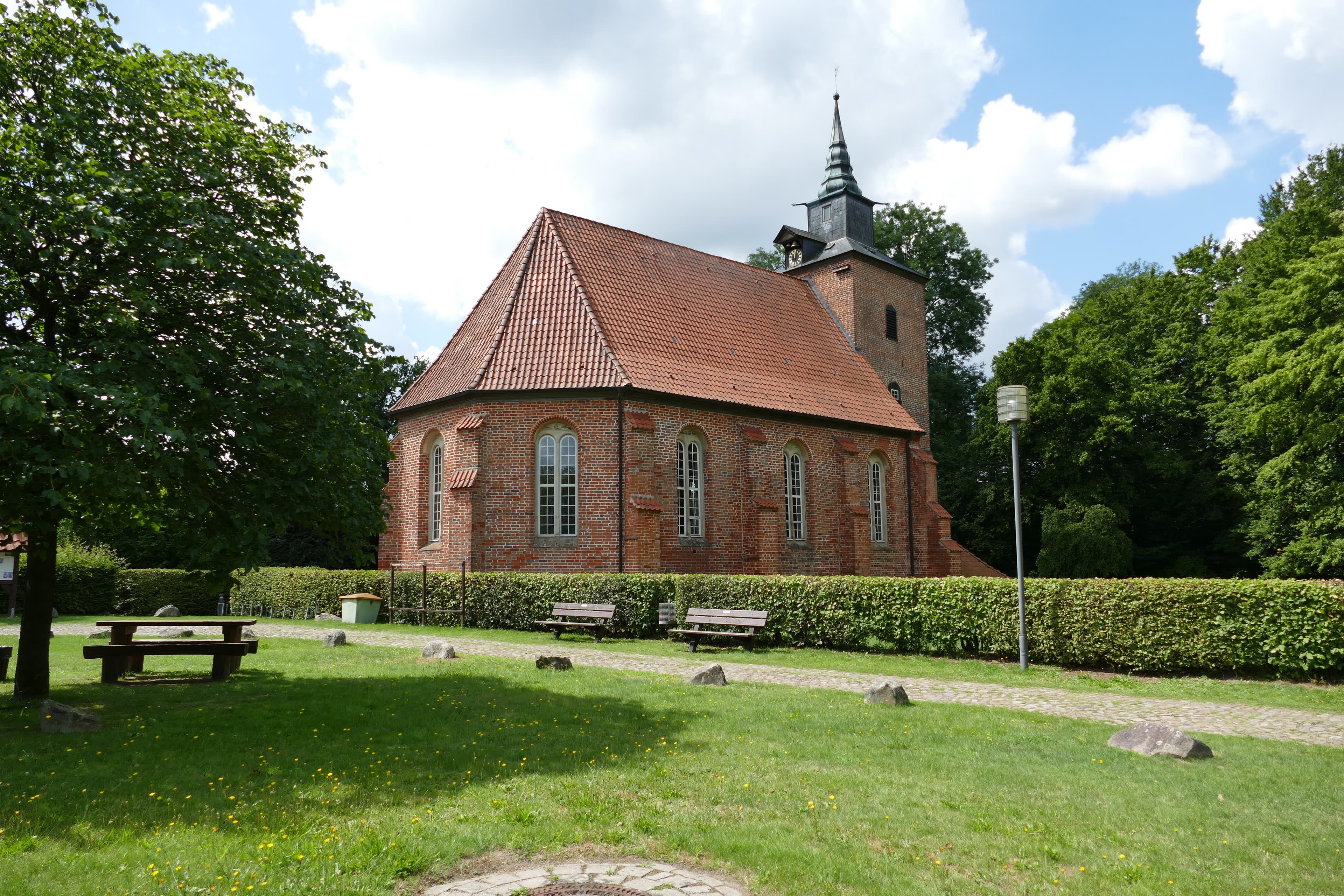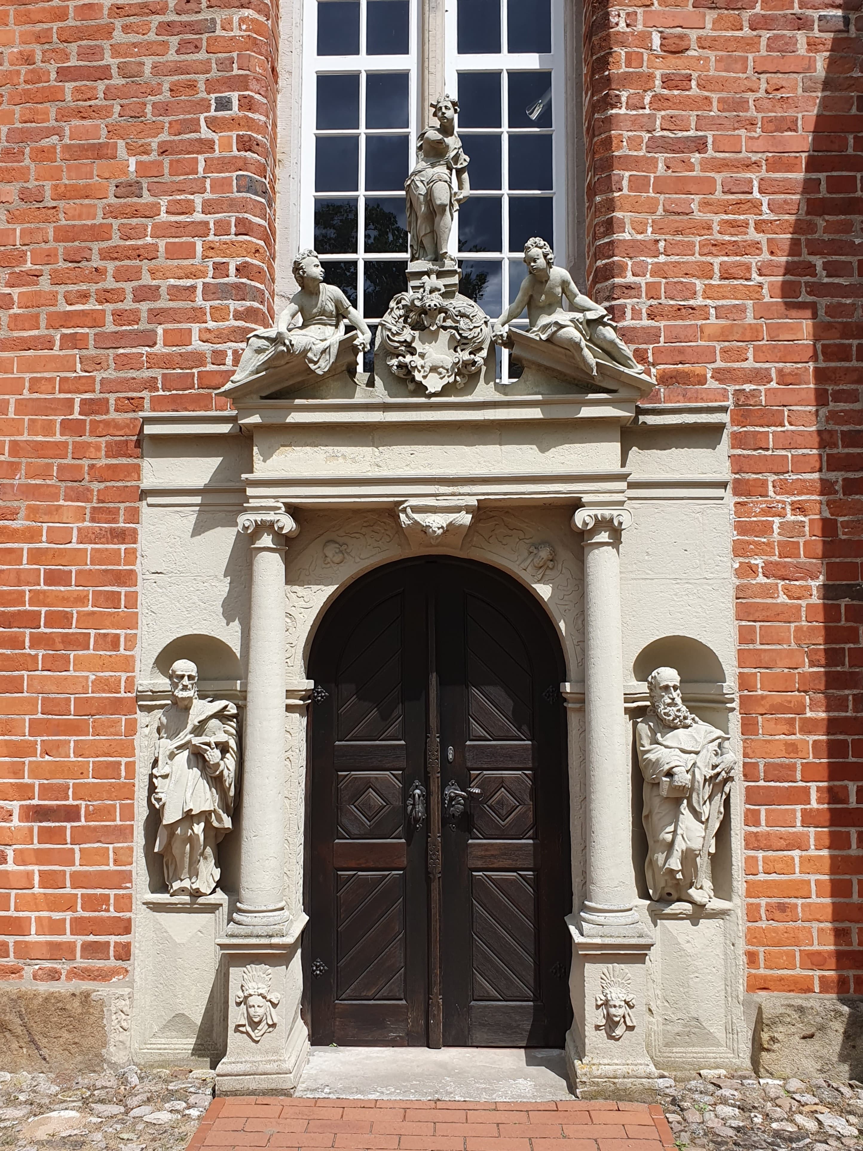 Der äußerlich einfache Backsteinbau erhielt ein mit Figuren und Wappen der Familie Behr geschmücktes Sandsteinportal. In den seitlichen Figurennischen eingelassen die Statuen von Petrus und Paulus. Unterhalb der reich geschmückten Turmspitze finden wir in schmiedeeisernen Ziffern das Erbauungsdatum.