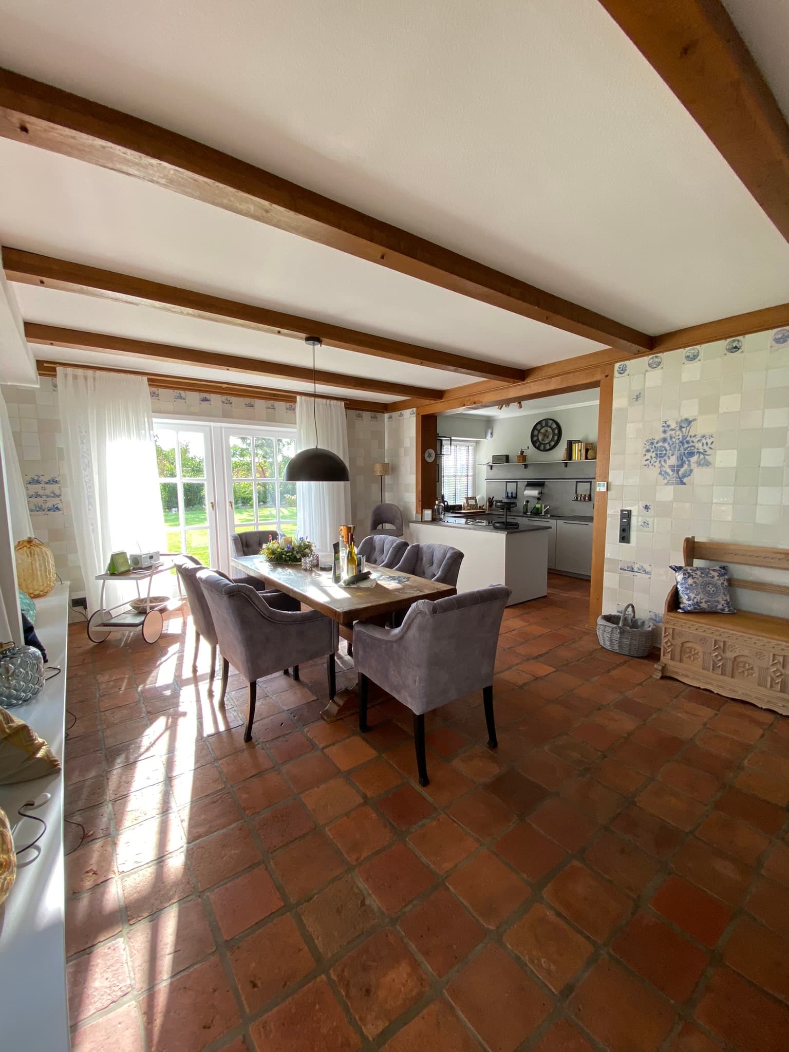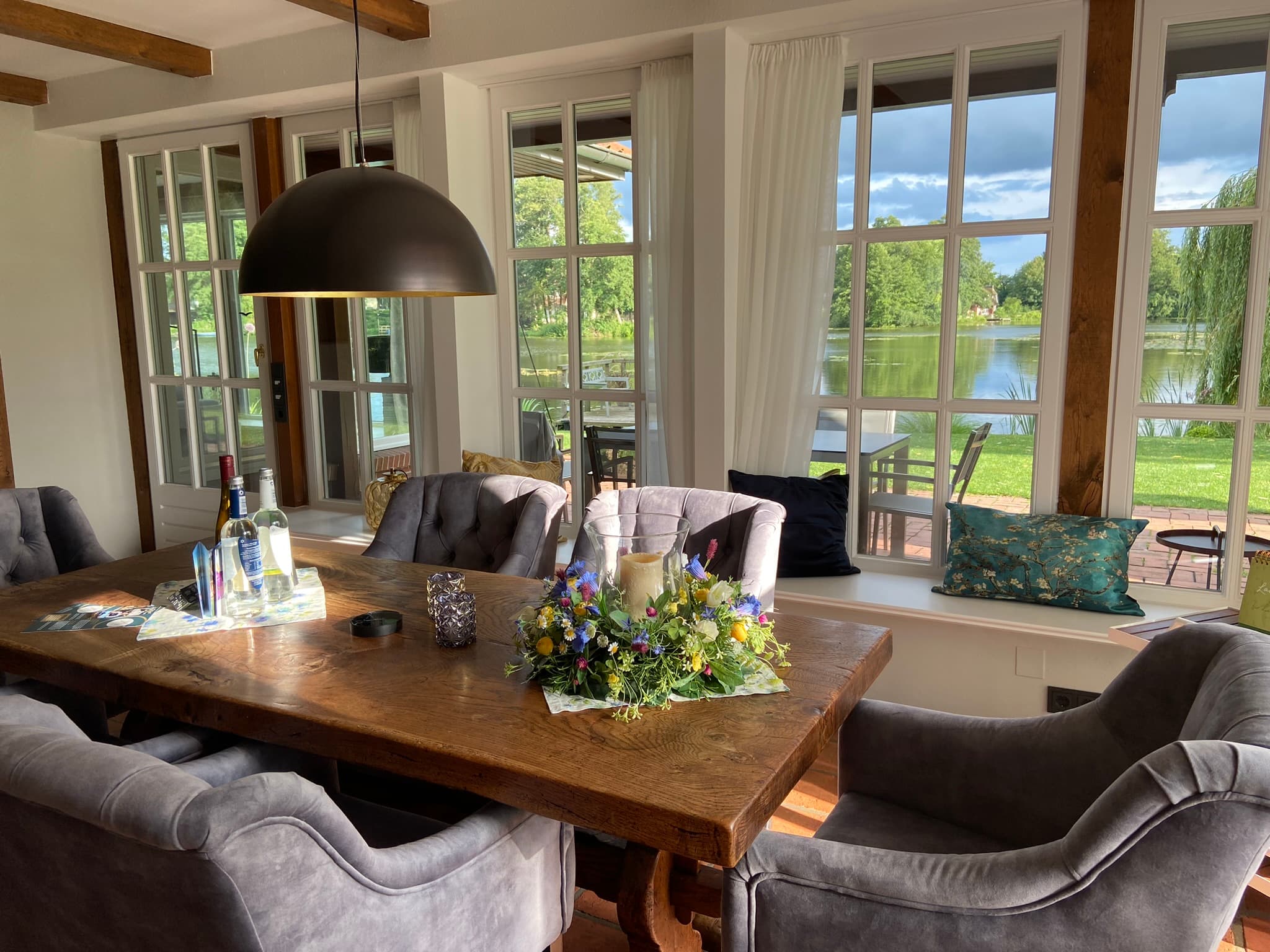 Im Landhaus Lotten werden Sie von einer großzügigen Diele empfangen. Dahinter liegen im Erdgeschoss mit Blickrichtung See das Wohnzimmer, der Essbereich und die Küche, vereint in einem großen Raum, dessen Terrakotta Fussboden sich über das gesamte Erdgeschoss erstreckt. Vom Esszimmer aus gelangen Sie auf unsere große, südlich ausgerichtete Sonnenterrasse am Ufer des Großen Bracks.