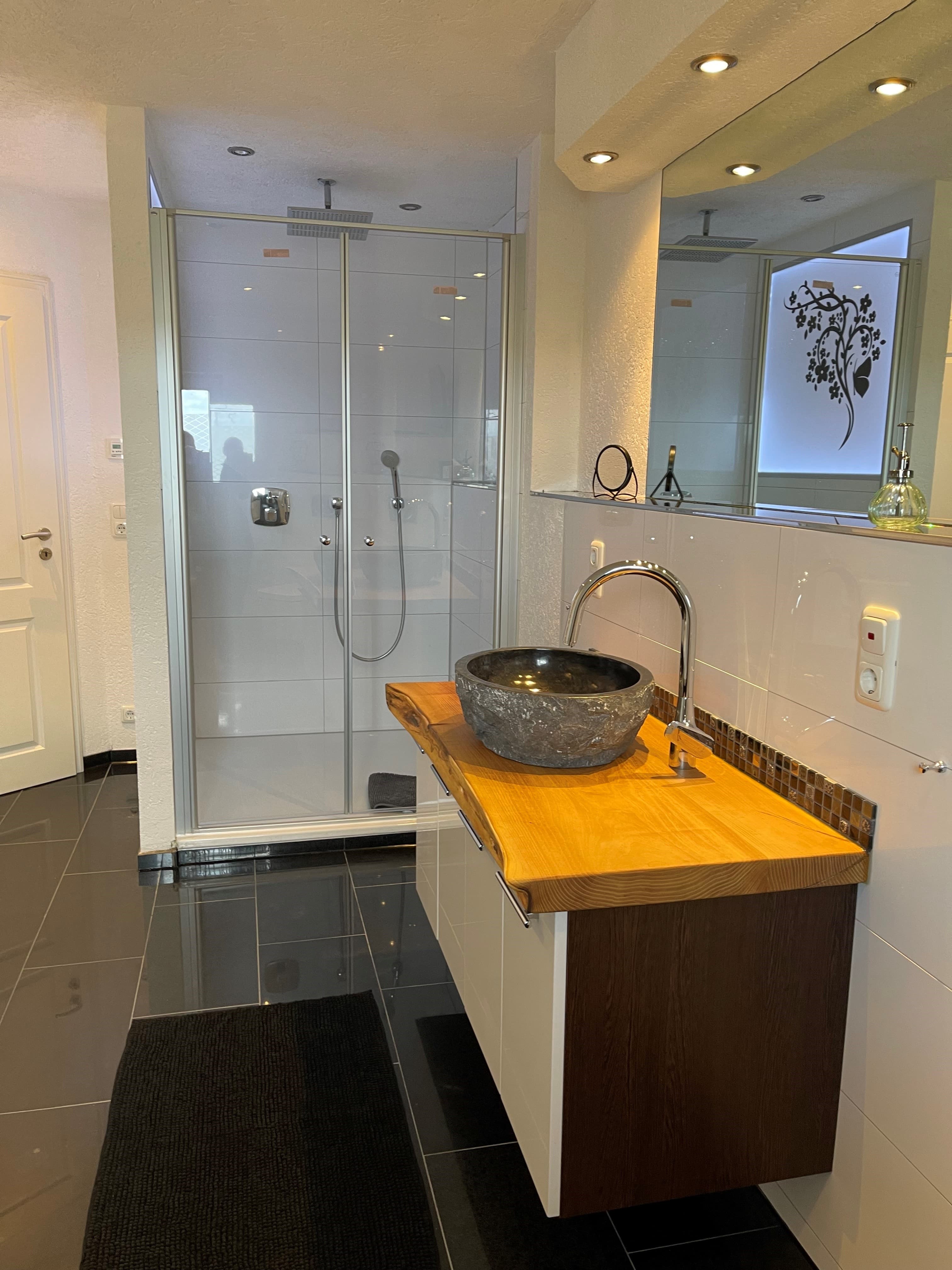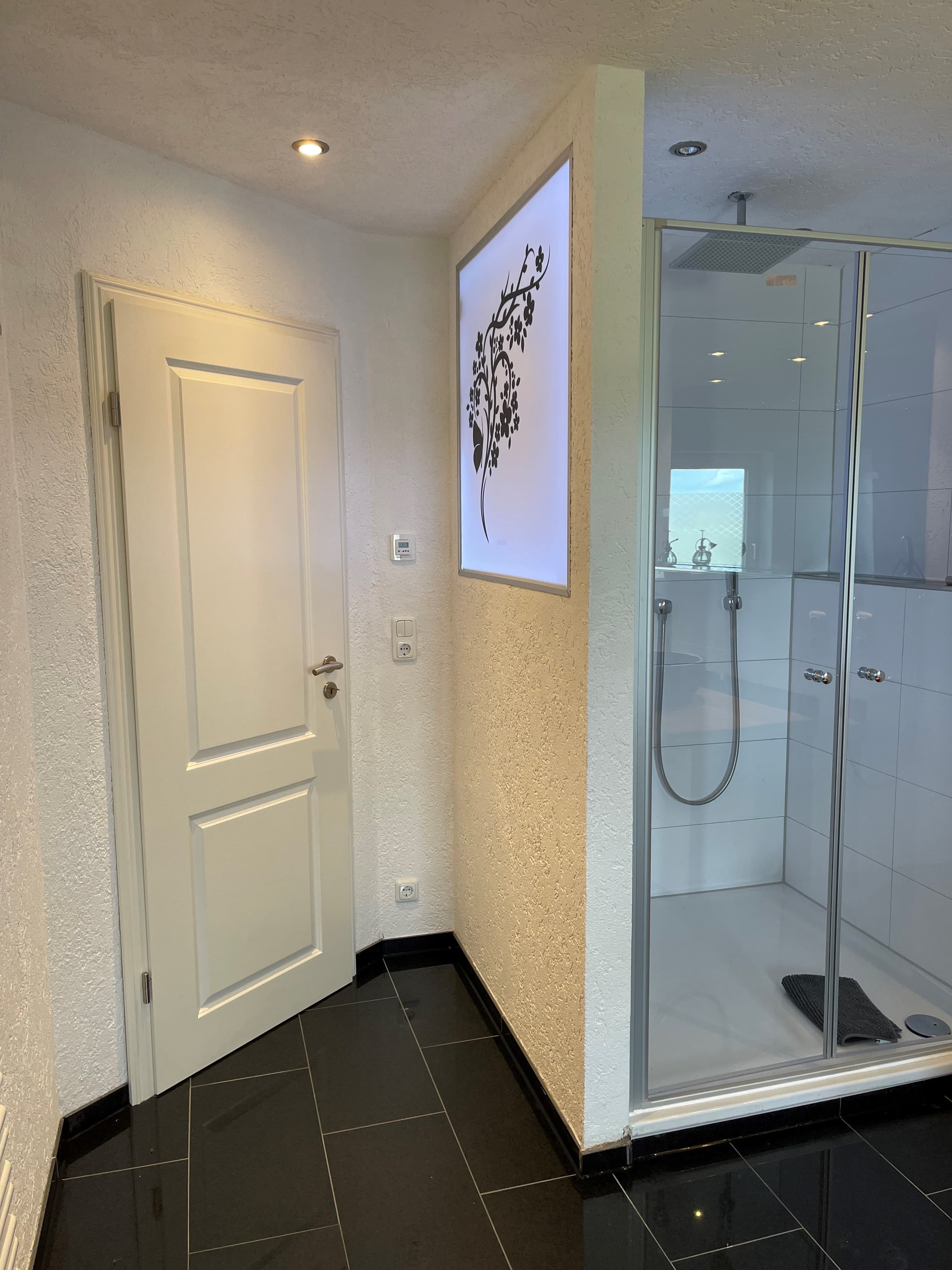 ein separates Schlafzimmer mit erhöhtem Boxspringbett und Ankleide, ein großes Badezimmer, eine separate Küche und ein großes Wohnzimmer mit 70 Zoll Smart-TV und Klimaanlage. Voll ausgestattete Küche, Badezimmer mit ebenerdiger 1,20m Regendusche Badewanne und TV.